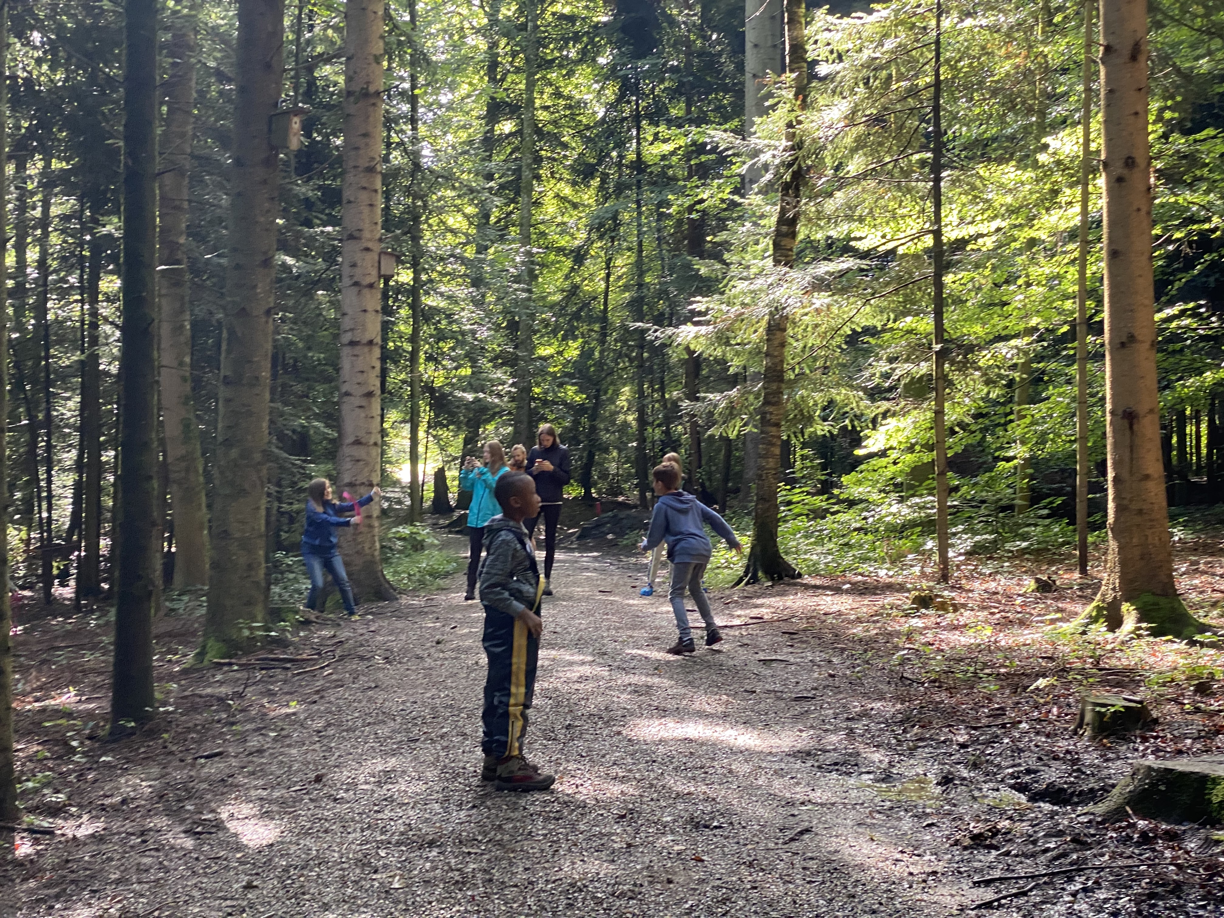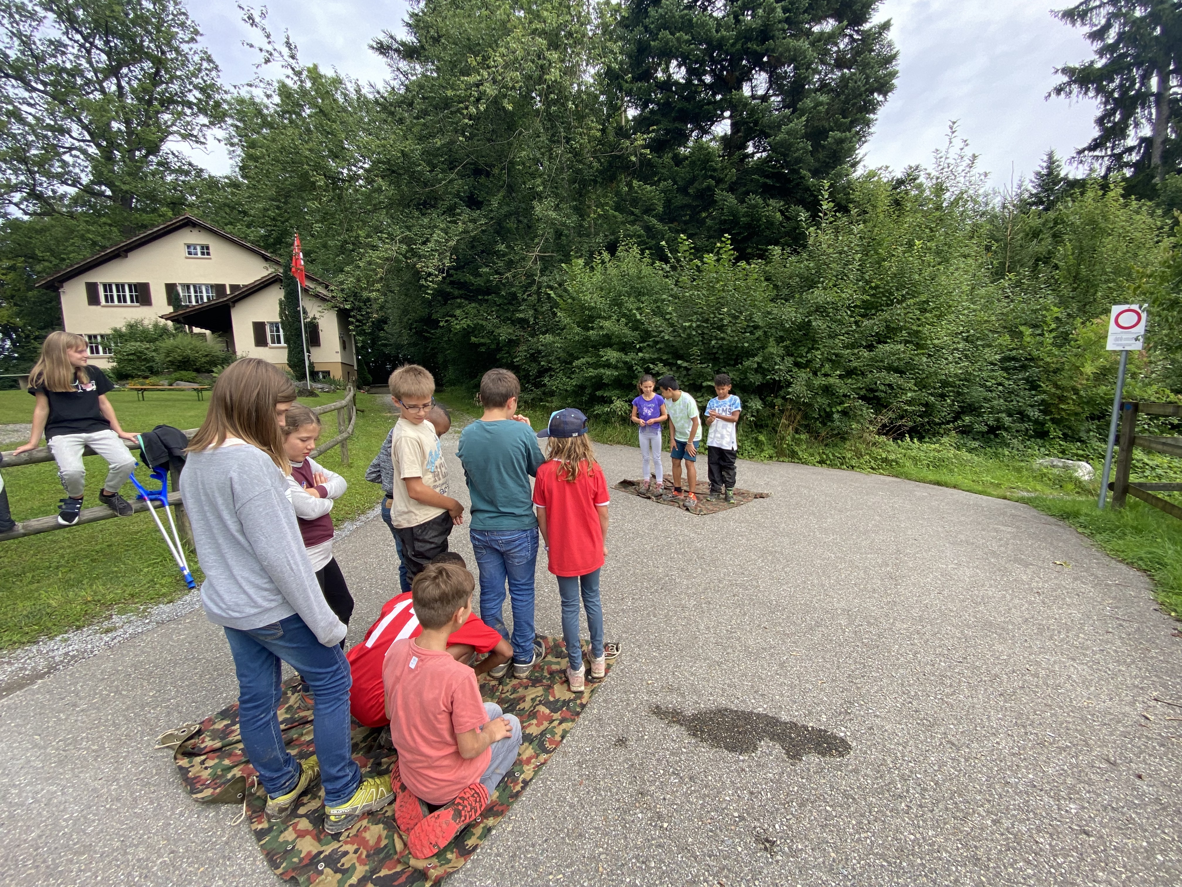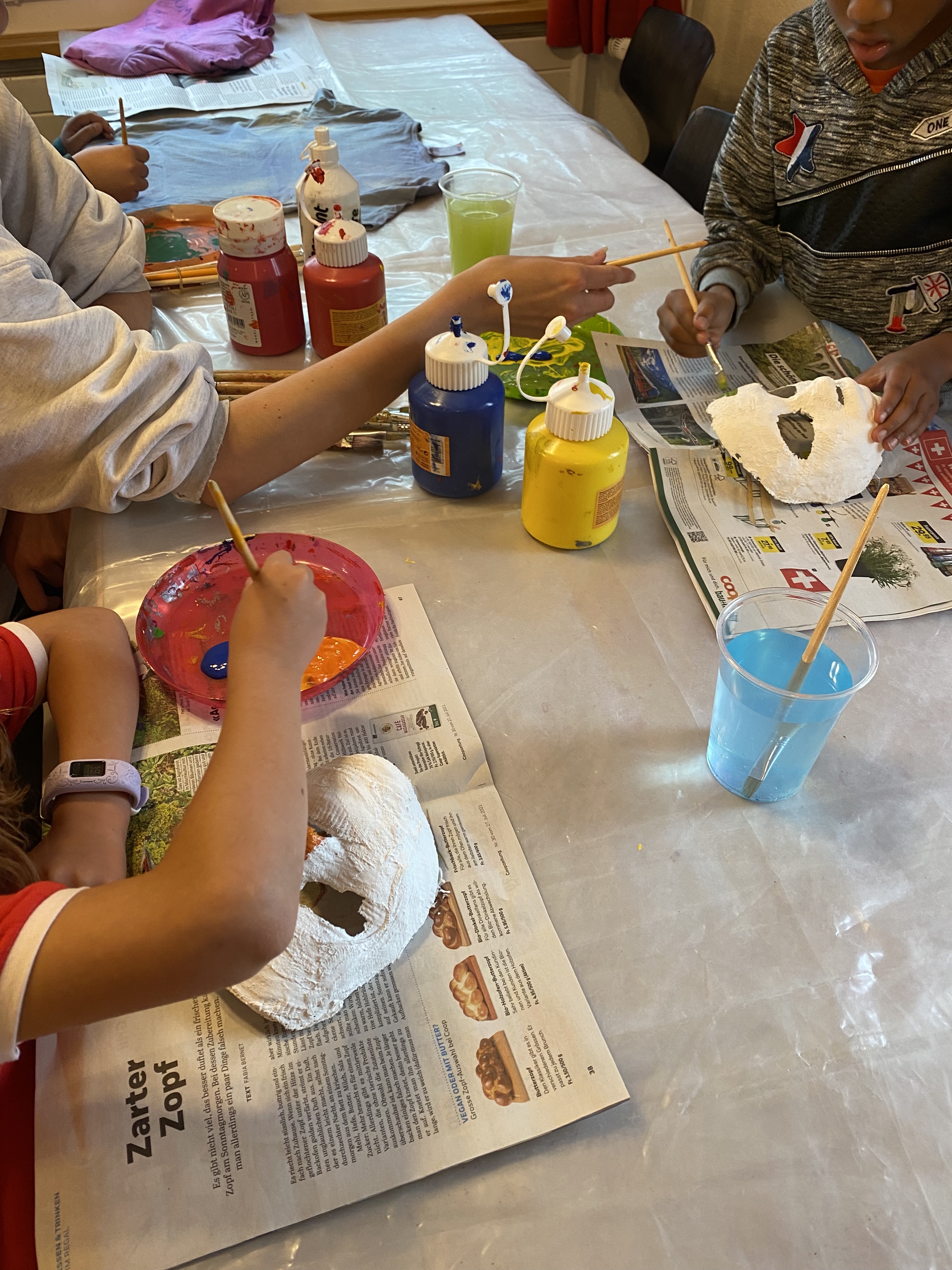 Wir sind um 7:45 Uhr aufgestanden. Wir haben ein Spiel gespielt und dann haben wir zu Morgen gegessen. Nachher sind wir in den Wald gegangen, es gab rote Bänderchen und pinke, man musste sie fersteken, es gab zwei Krokodile. Nachher haben wir Dodo gespielt. Dann gab es noch z’Nüni. Sieben Jungs sind auf den Spielplatz gegangen. Die Mädchen sind ins Haus gegangen.Vor dem Mittagessen haben wir gebastelt. Wir haben die Gipsmasken angemalt und Böötli aus Papier gefaltet.