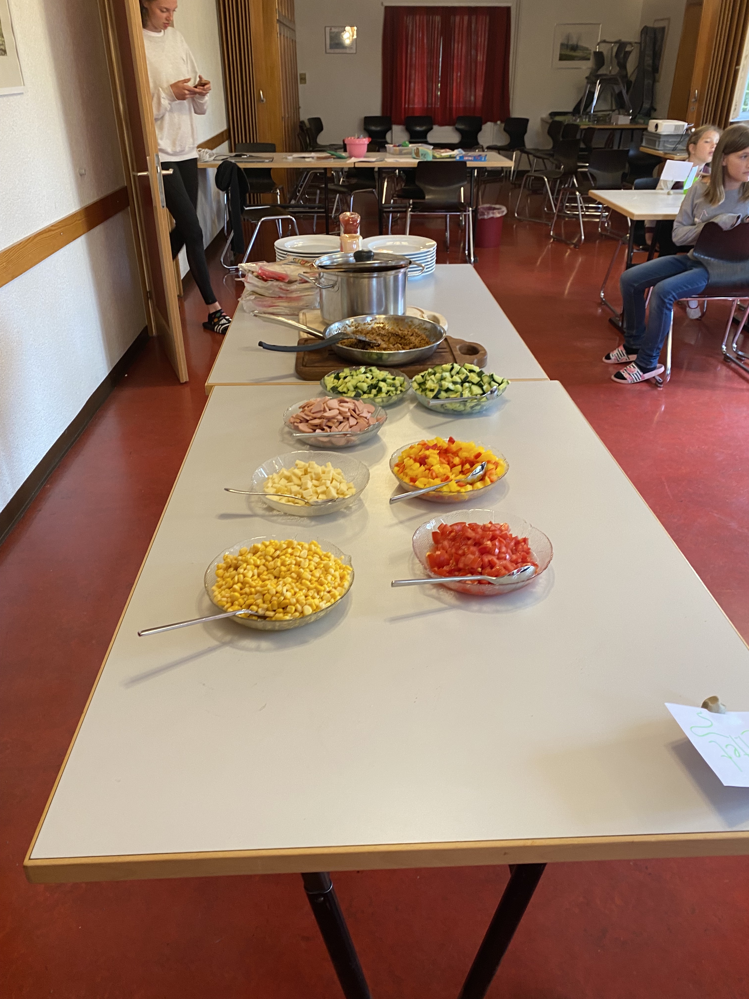 Zum Z’Mittag haben wir Rebs (Wraps) gegessen. In den Rebs hatte es Gurken, Peperoni, Mais, Klöpfer, Tomatensauce, Tomaten, Käse, Meionese, Cocteil, Ketchup.