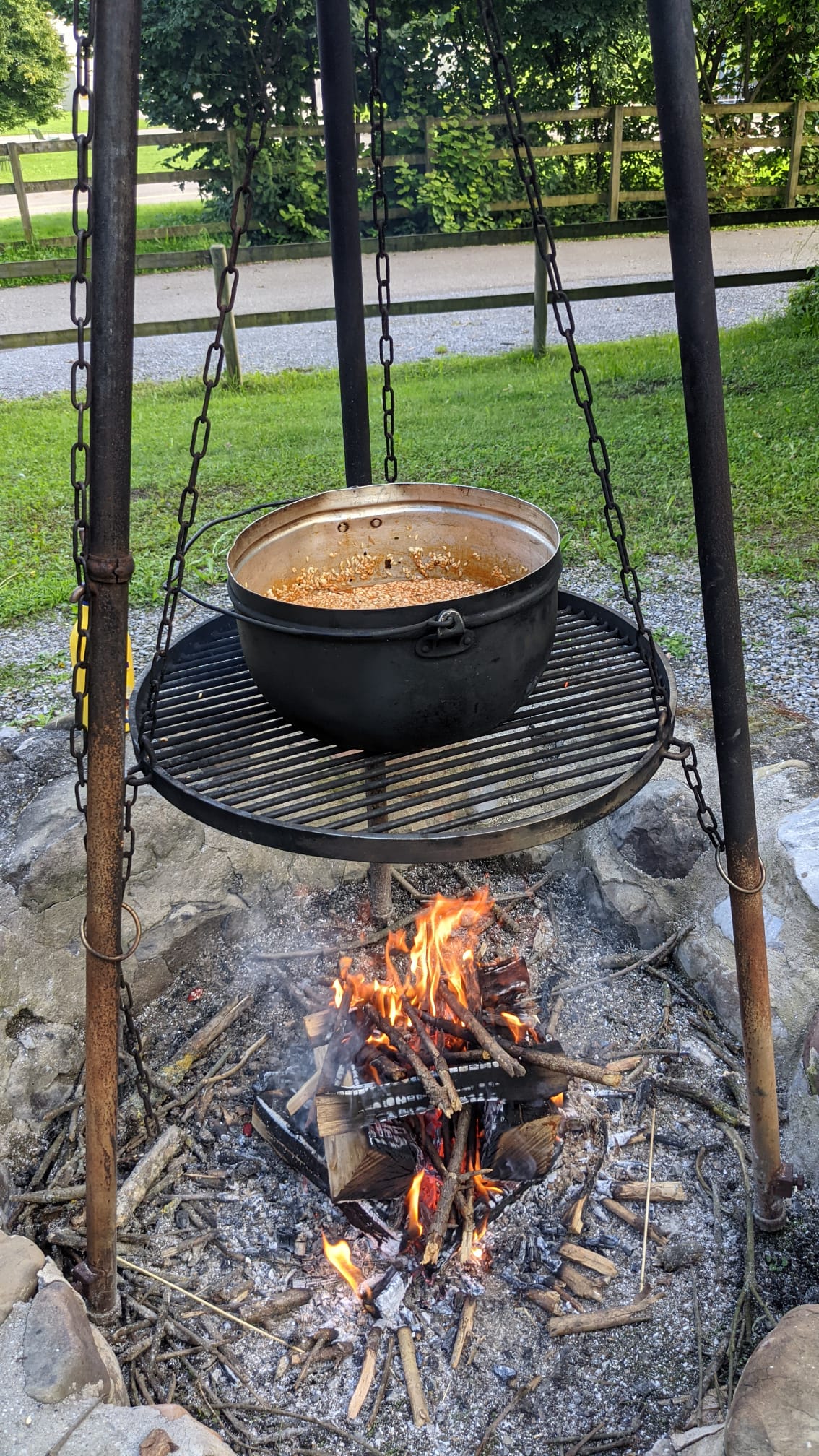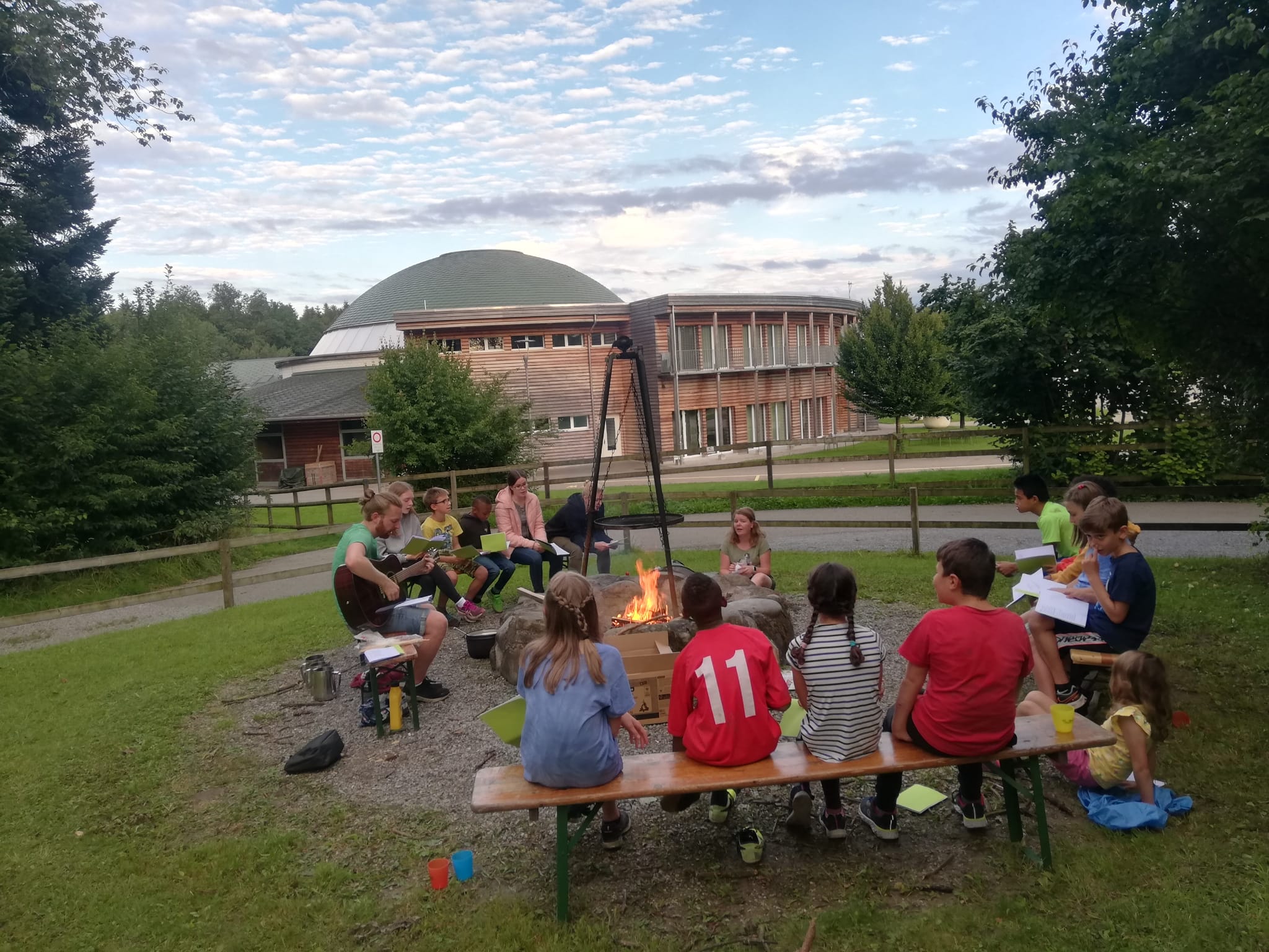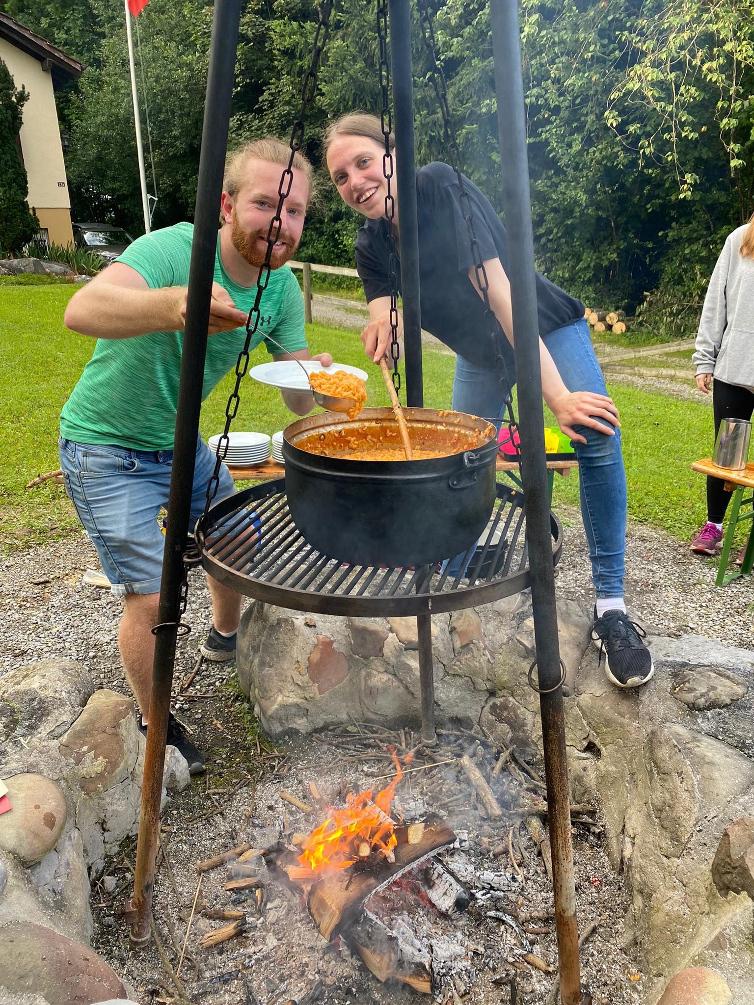 Während wir nochmals ein paar Spiele machen durften oder Briefchen schreiben durften, haben Florentina und Jan ein Lagerfeuer angezündet. Am Feuer durften wir Marshmallows am Spiess grillieren. Anschliessend kochten Jan und Florentina ein feines Tomatenrisotto auf dem Feuer. Wir sassen auf Bänken um die Feuerstelle und haben draussen zu Abend gegessen. Danach haben wir das Feuer nochmals gross angezündet und haben viele Lieder gesungen.