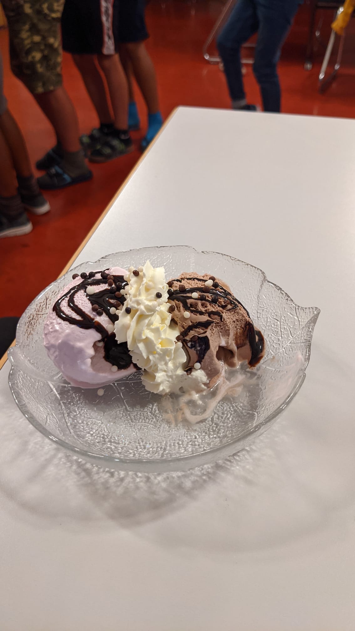 Zum Dessert gab es ein grosses Glacé-Buffet mit Vanille, Schokolade, Erdbeer und Straciatella! Wir durften auch Rahm, Schoggisauce und Streusel oder Smarties auf unsere Glacés haben. Danach sind wir mit vollem Bauch schlafen gegangen.