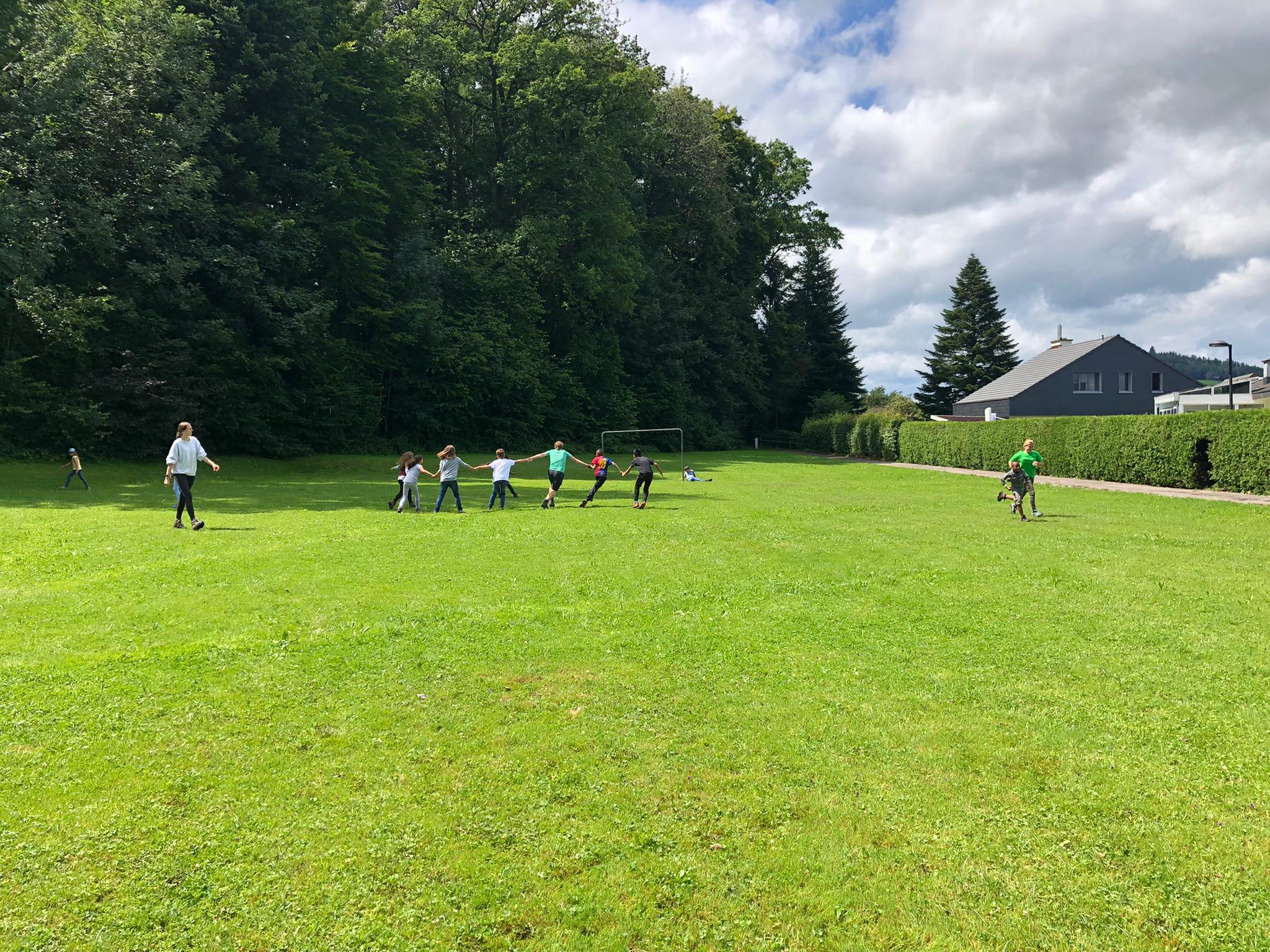 Nach dem Abwasch und dem Zähneputzen haben wir im Buch weitergelesen und sind anschliessend auf den Spielplatz gegangen, um verschiedene Fangen zu spielen. Das war sehr anstrengend. Zum Mittagessen gab es Flammenkuchen und Salat. Das Essen war wie immer diese Woche sehr gut!