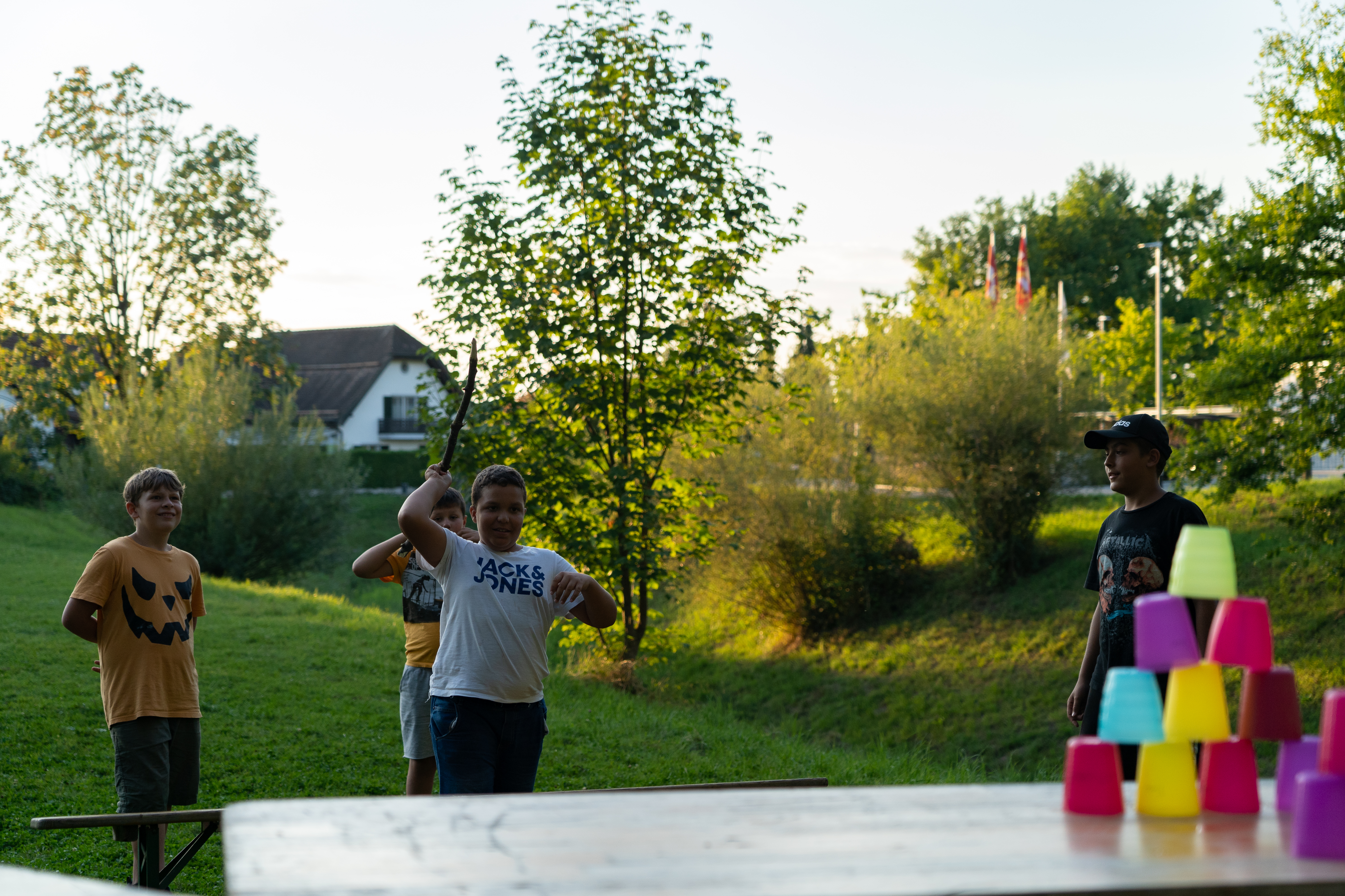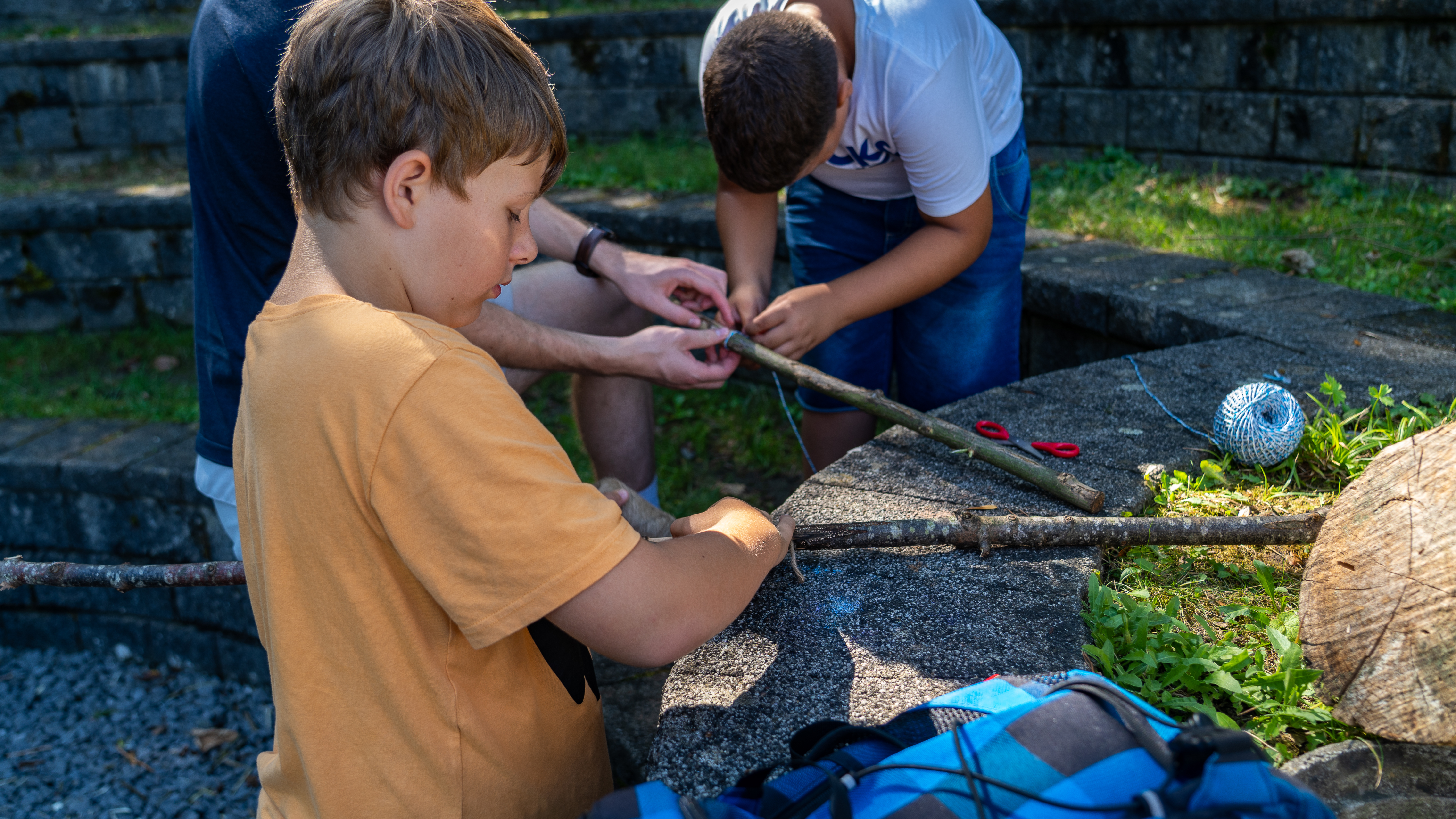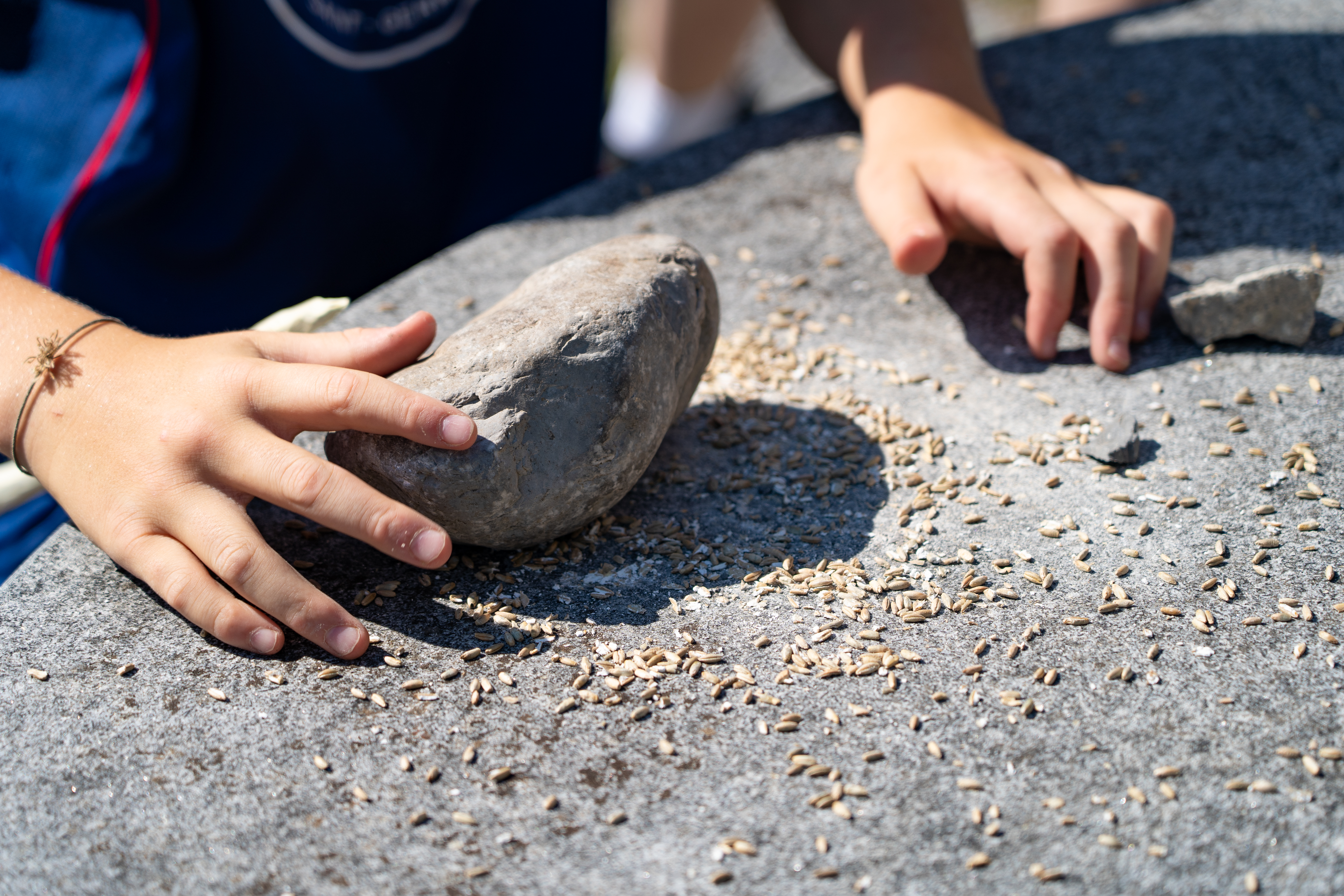 Für eine Erfolgreiche Mammutjagd braucht es natürlich einen Speer. Mit Noé und Cedric haben wir geeignetes Holz gesucht und anschliessend zurechtgeschnitzt und verziert. Auch das Gemüse für das Mittagessen haben wir selbst geschält und geschnitten. Für alle, die noch Lust hatten durften versuchen mit Steinen aus Korn selbst Mehl zu mahlen.