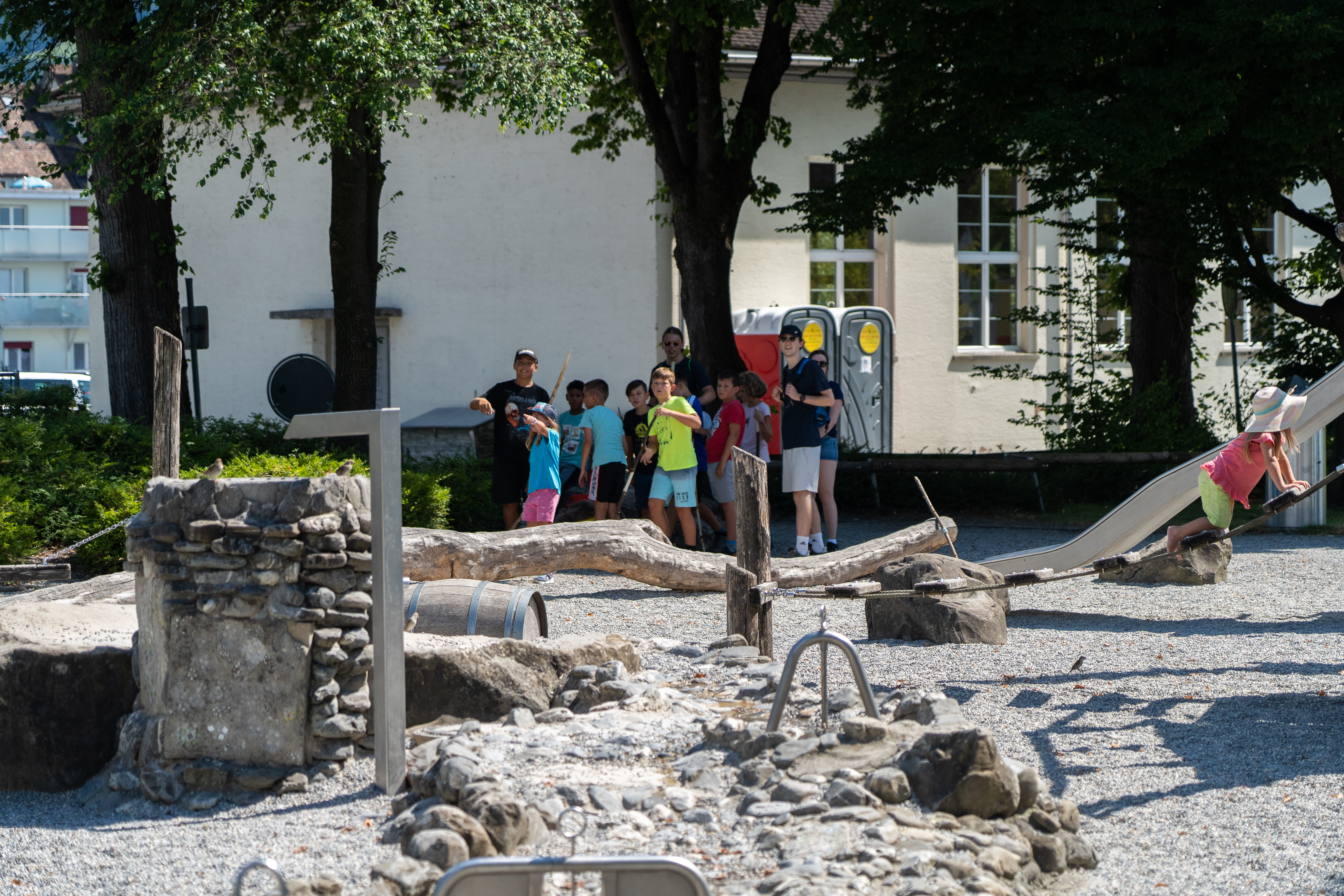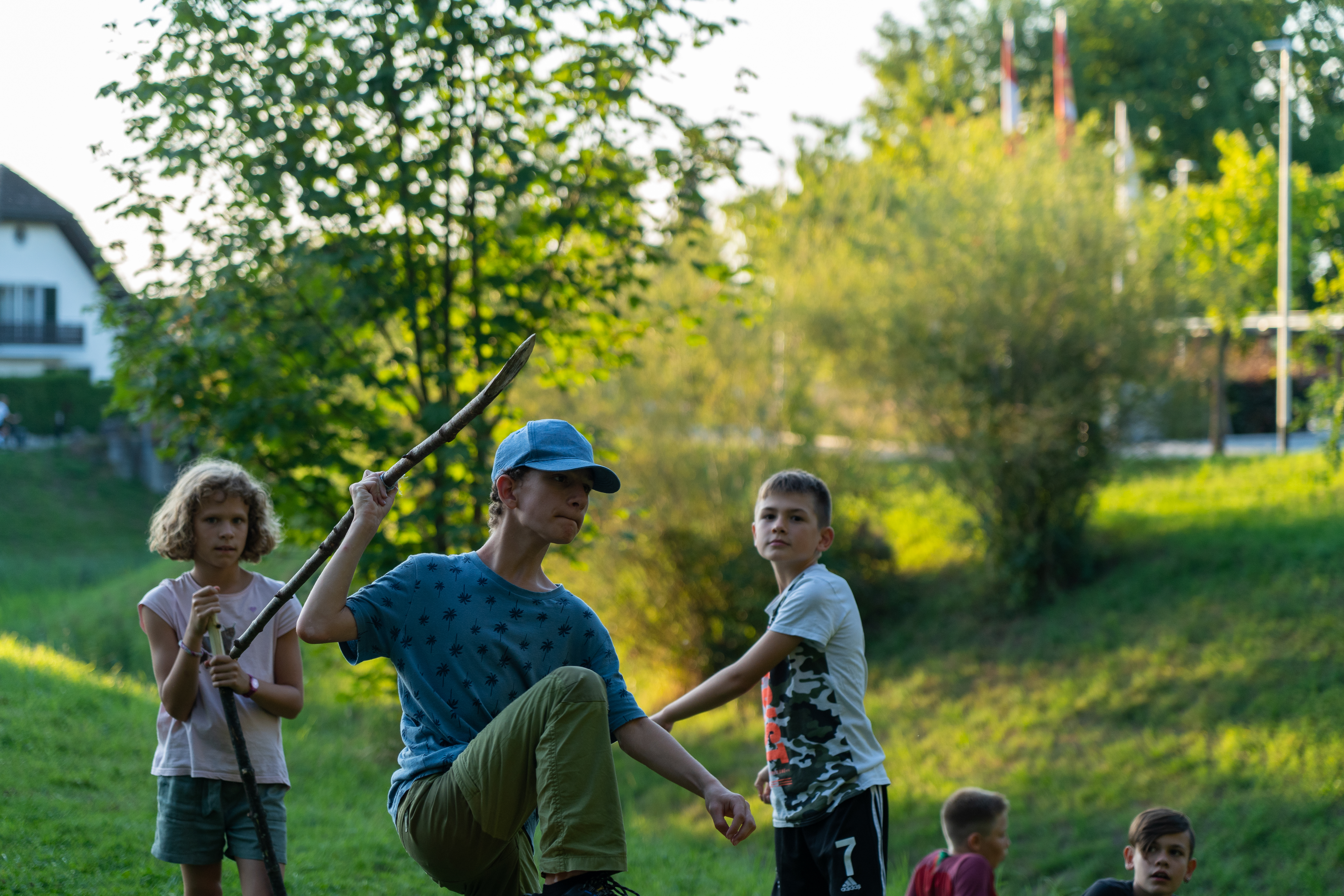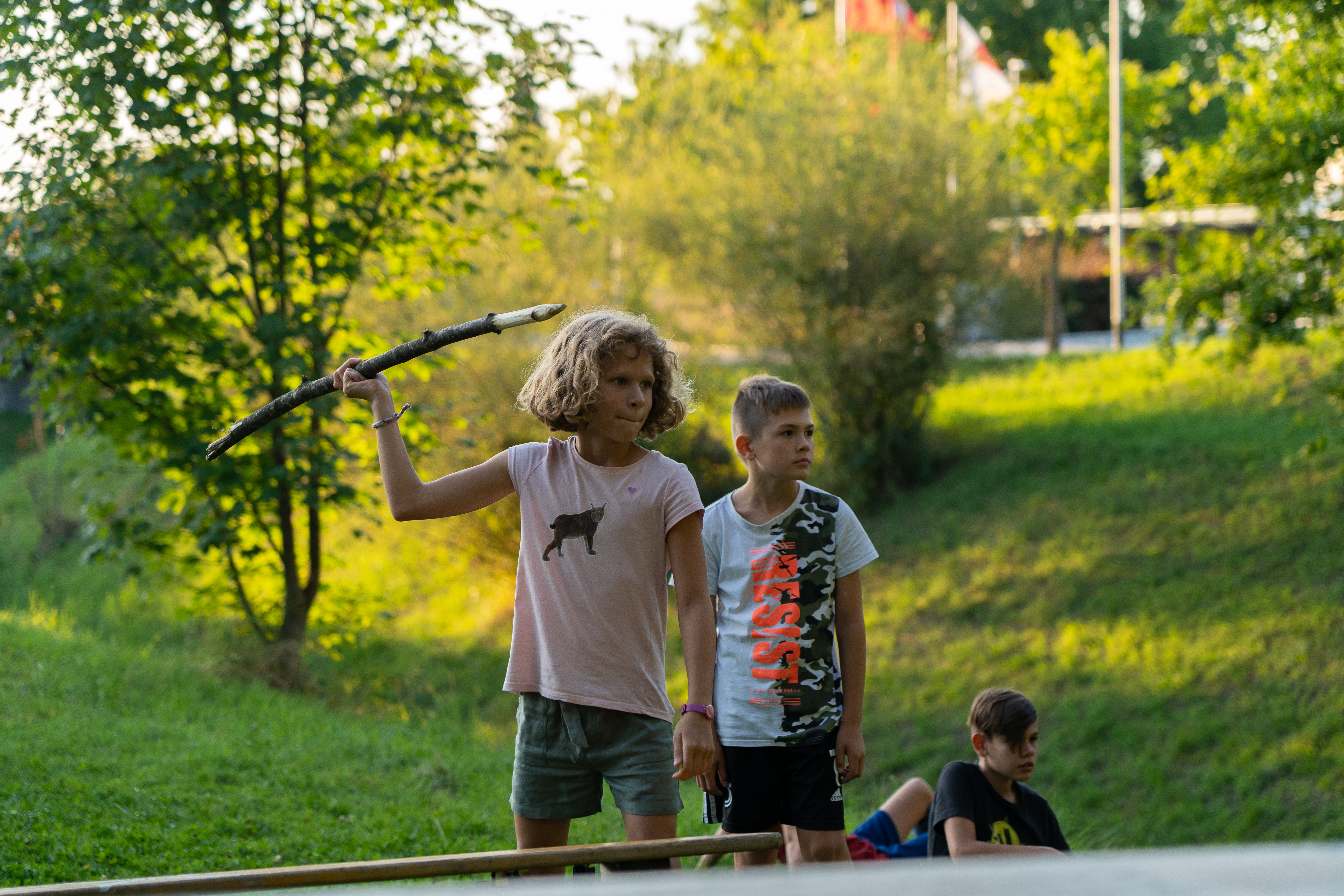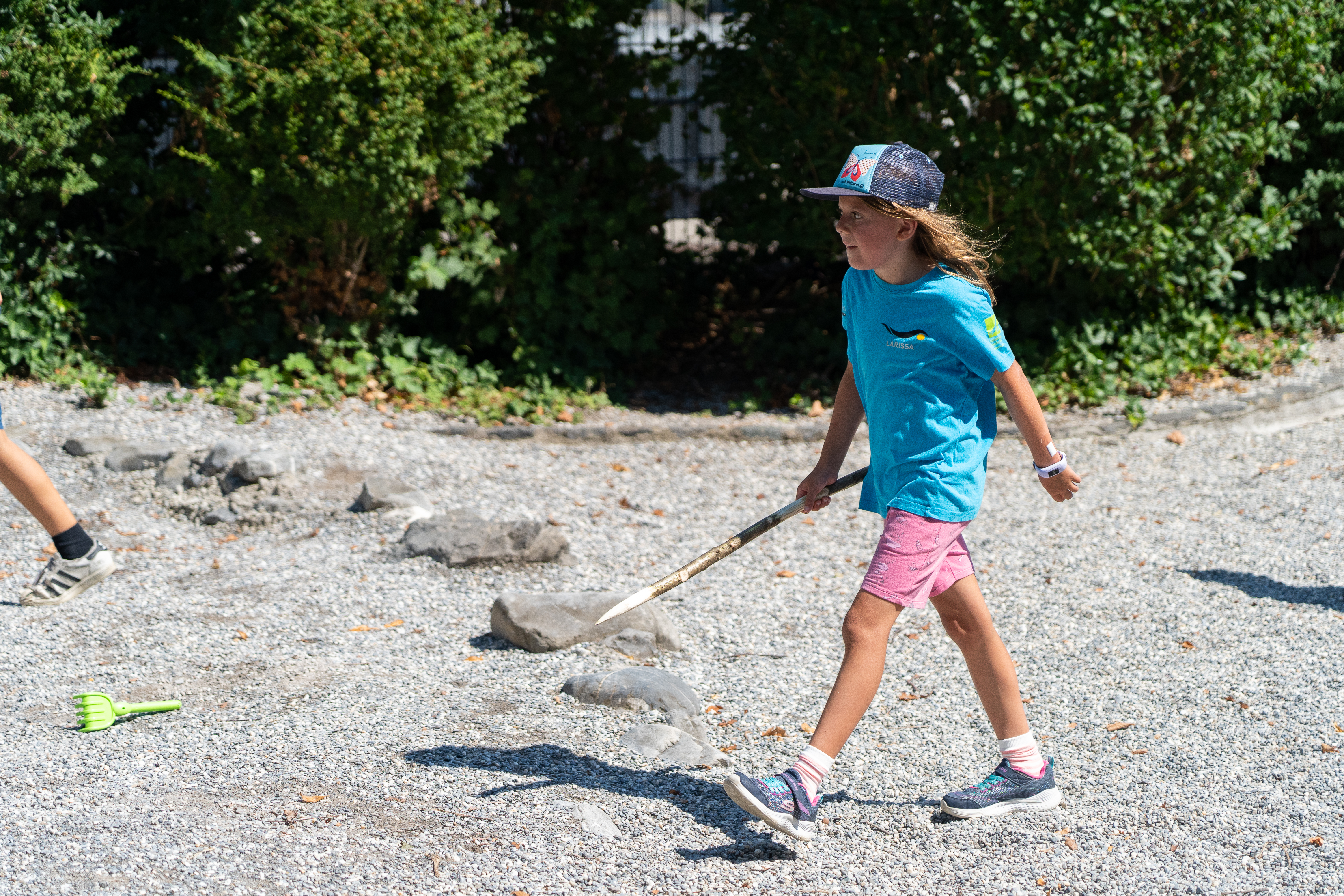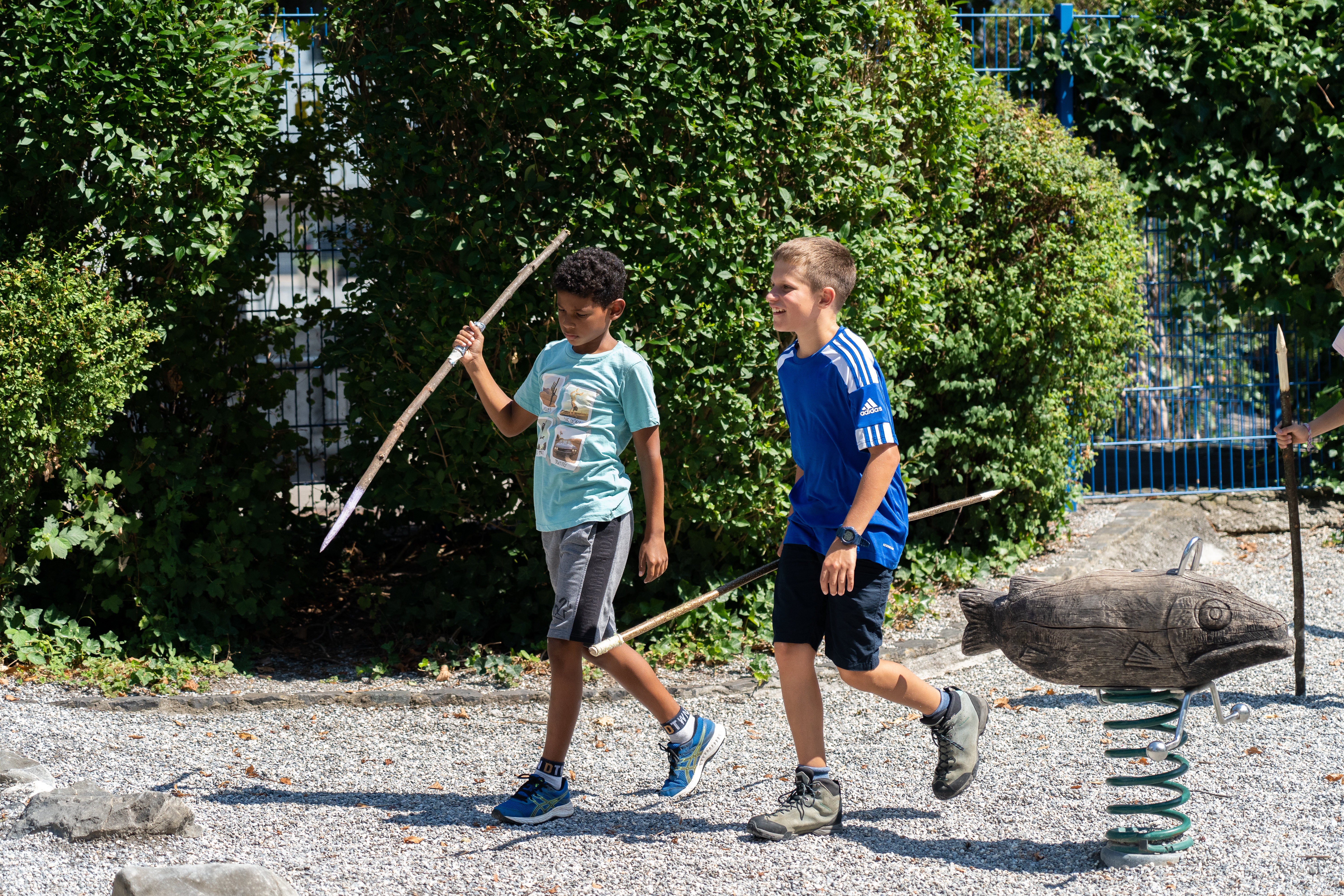 Am Nachmittag durften wir unsere Fähigkeiten bei einer Mammut-Schnitzeljagd unter Beweis stellen. Der verwinkelte Weg voller Sackgassen führte uns mit Speeren bewaffnet bis an das Seeufer, wo sich das Mammut auf einem Spielplatz versteckte.