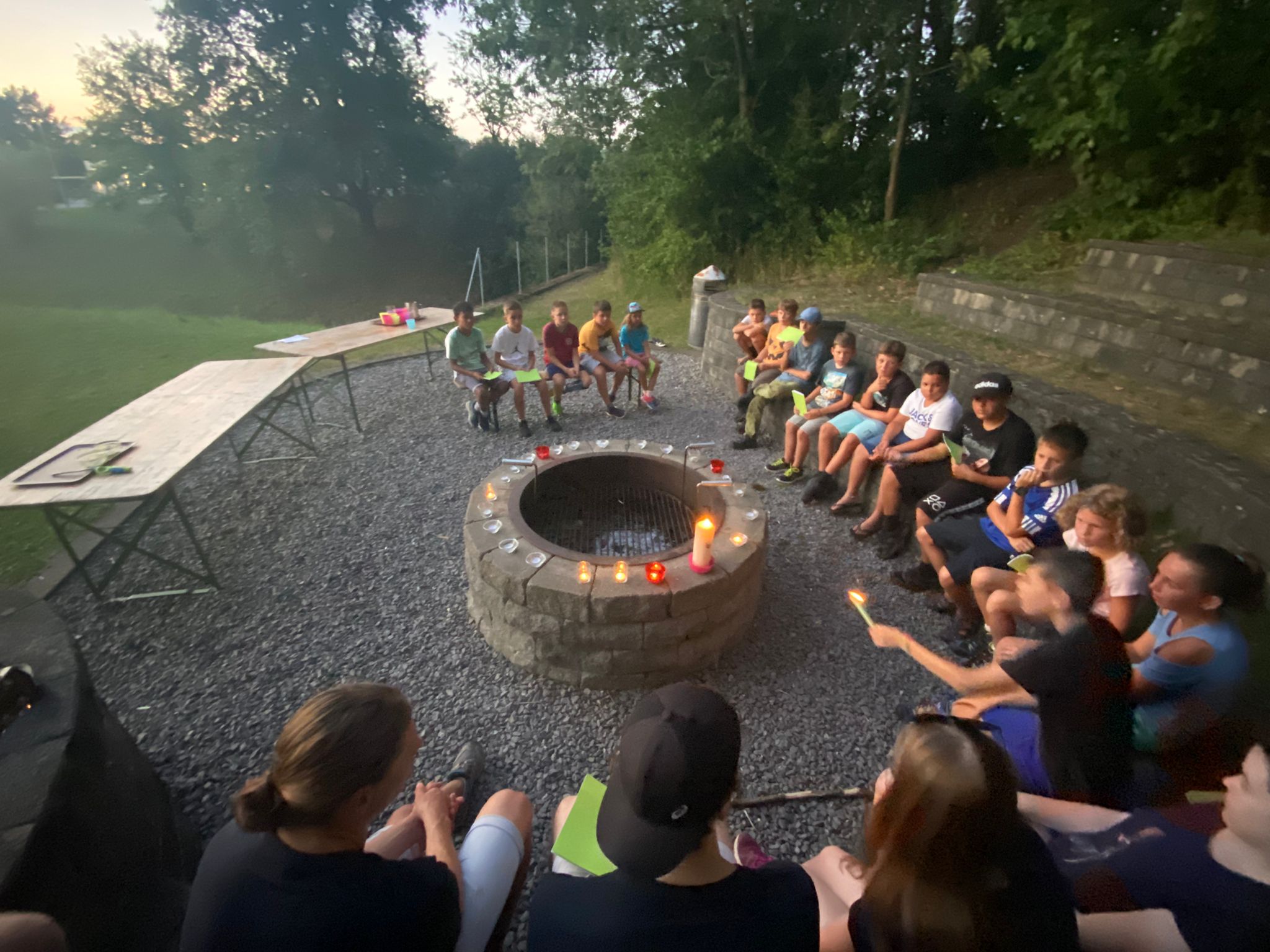 Am Abend gab es eine Steinzeit-Olympiade mit Speerwurf, Höhlenmalerei (Montags-Maler), und Dessert suchen. Nach der Siegerehrung und dem Dessert am Feuer zündeten wir Kerzen an und sangen noch einige Lieder bevor es müde ins Bett ging.