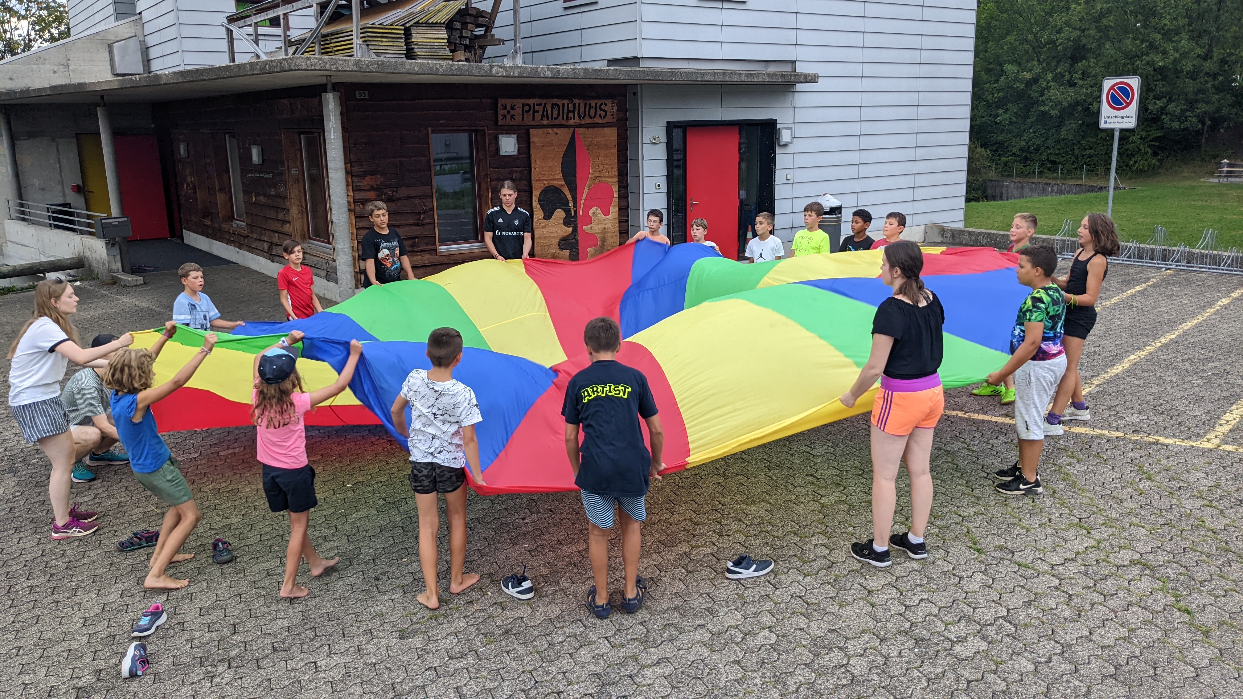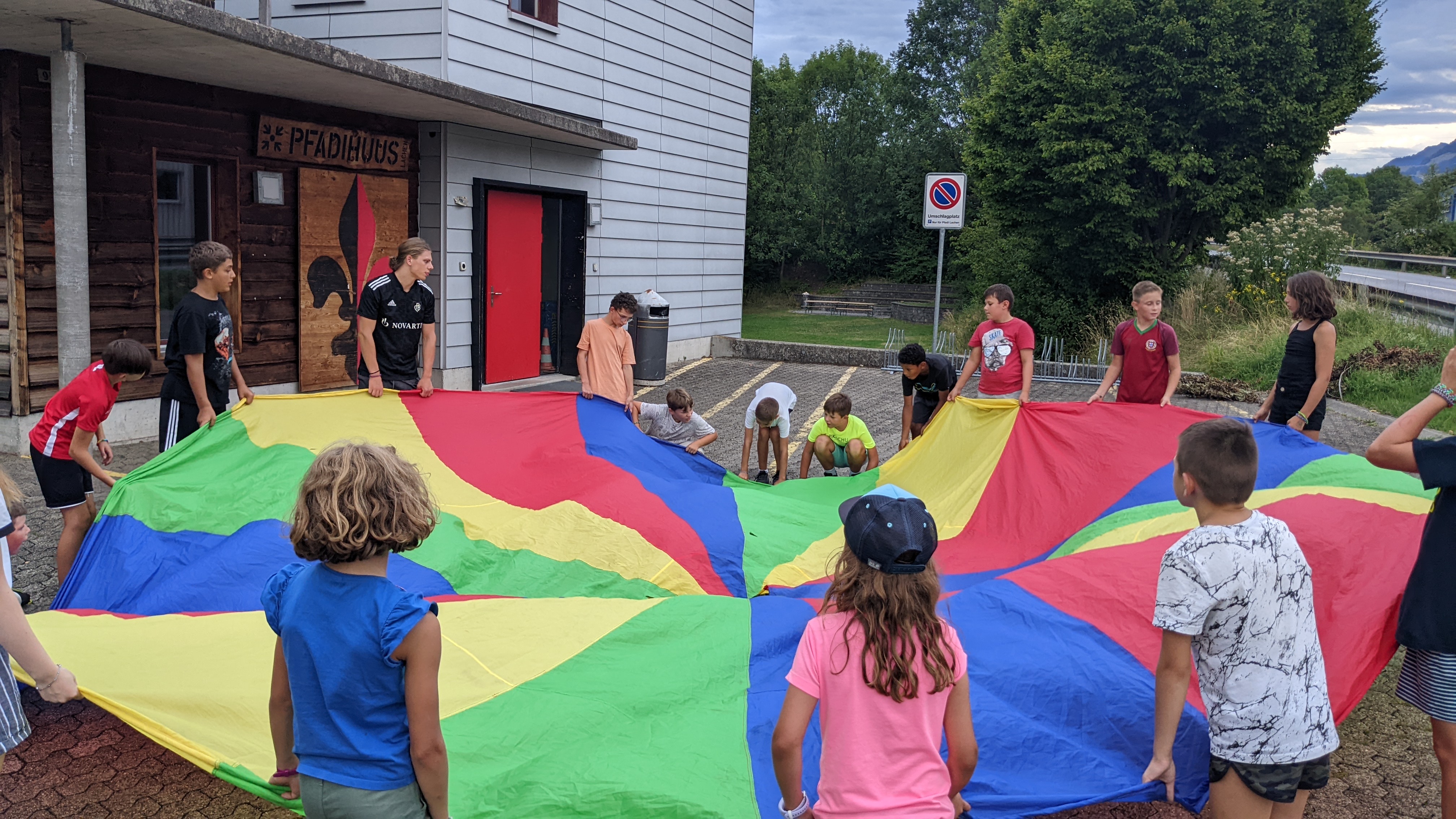 Nach dem Znacht spielten wir noch mit dem grossen Fallschirm bevor es Schoggifondue zum Dessert gab. Den Tag liessen wir wie immer mit ein paar Liedern ausklingen.