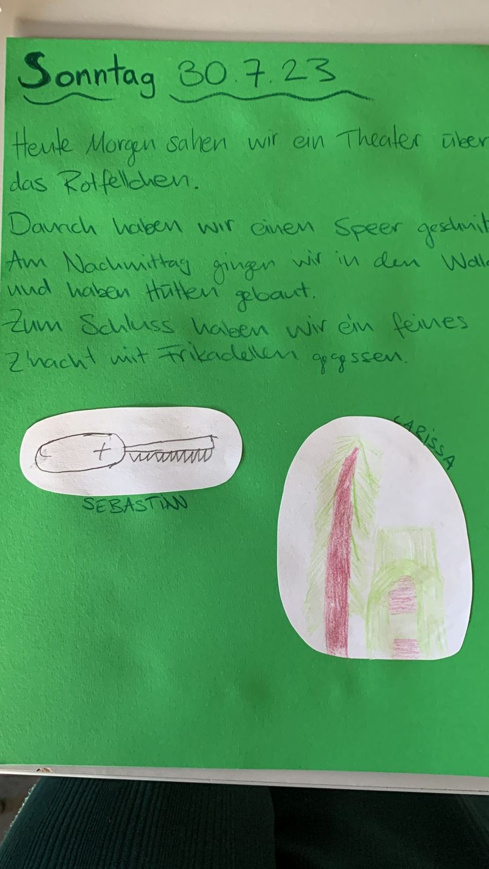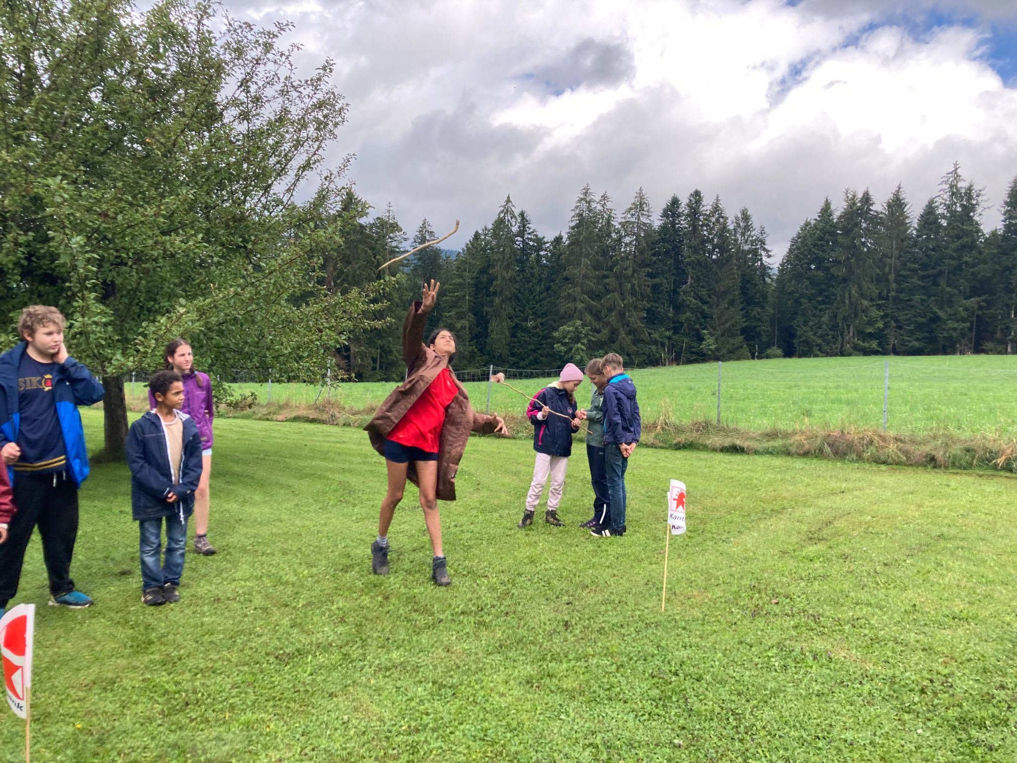 Am ersten ganzen Tag unseres Lagers sind wir in die Steinzeit gereist und bekamen das Märchen von Rotfellchen (Rotkäppchen) vorgestellt. Noé, Ivana und Aaron haben ein super Theater vorbereitet!