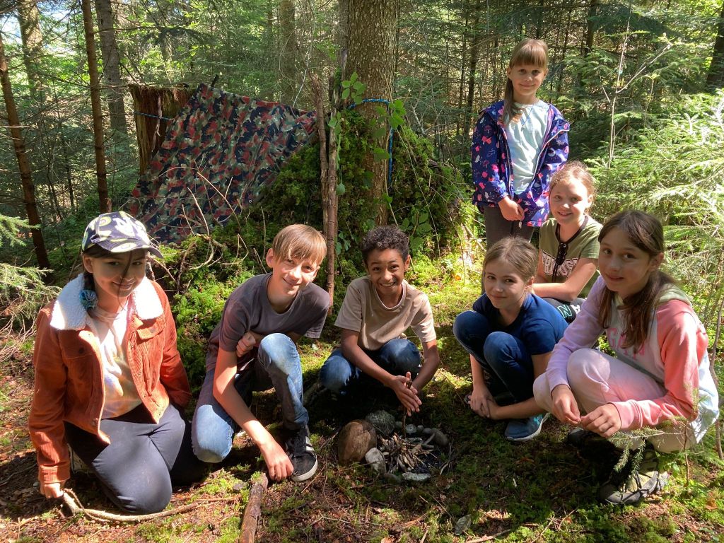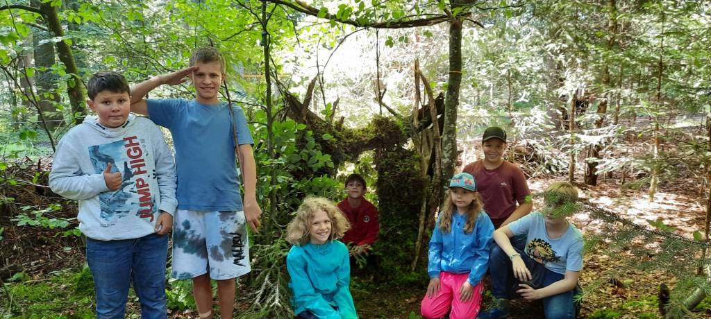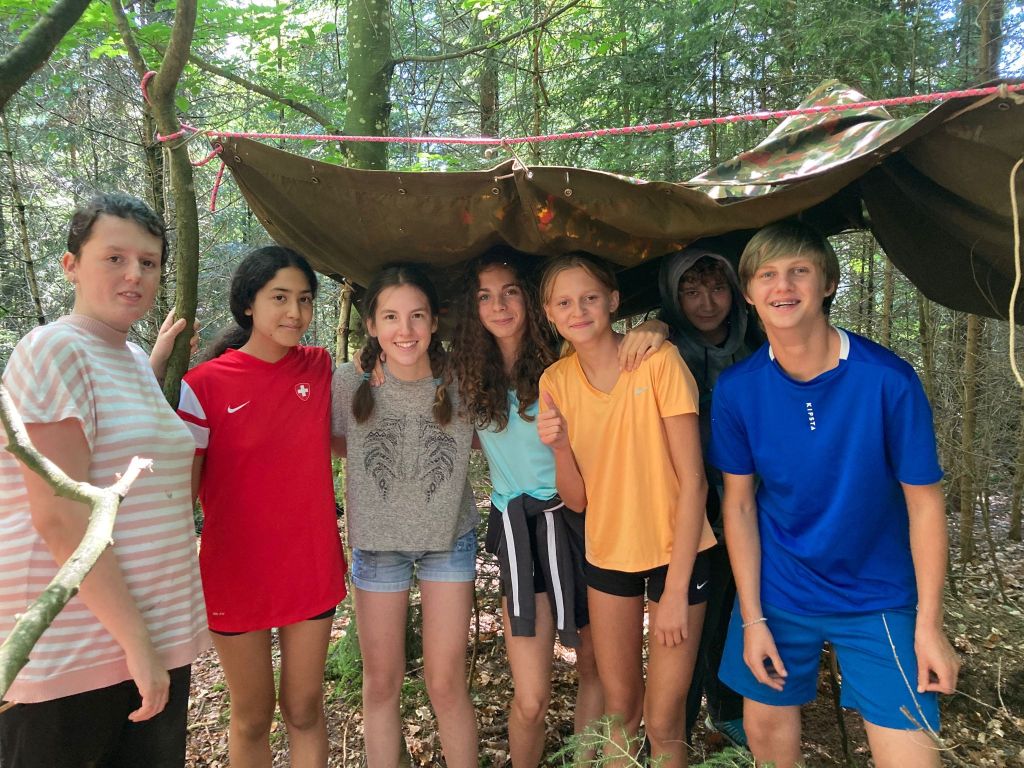 Ausgeruht haben wir uns am Nachmittag auf den Weg in den Wald gemacht. Dort haben wir in Gruppen und mit Blachen ausgerüstet versucht eigene Hütten zu bauen. Dazu haben wir Aste, Blätter, Moos und weitere Materialien im Wald gesucht und unsere eigenen „Häuser“ gebaut. Die Resultate der Gruppen waren alle sehr unterschiedlich, und dennoch hatten alle viel Spass und bauten am Ende eine super tolle Hütte.
