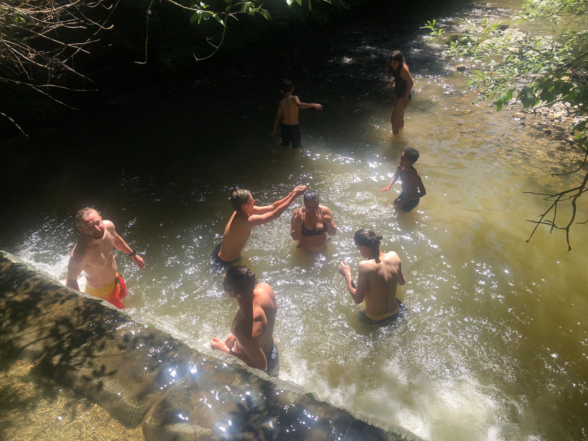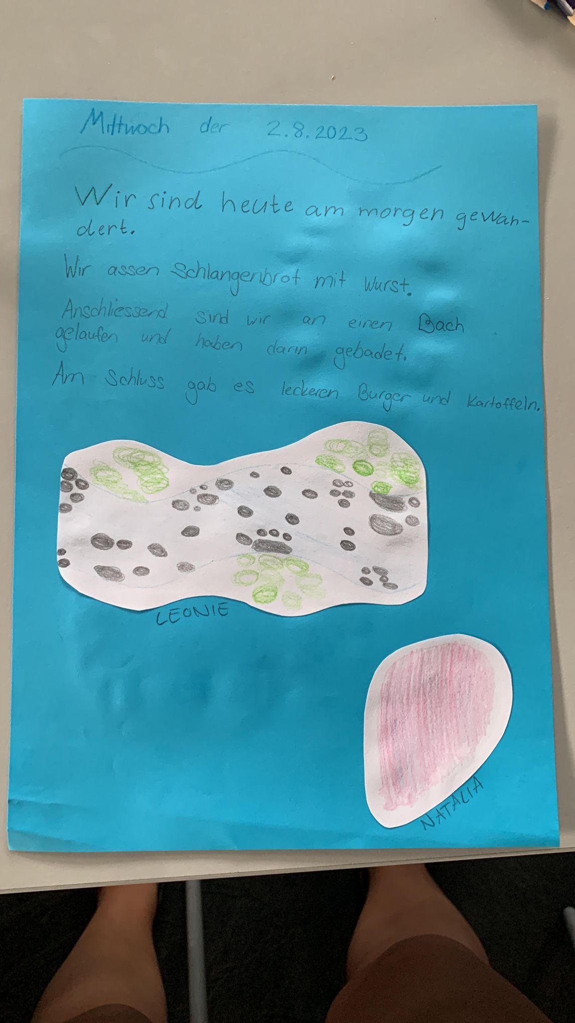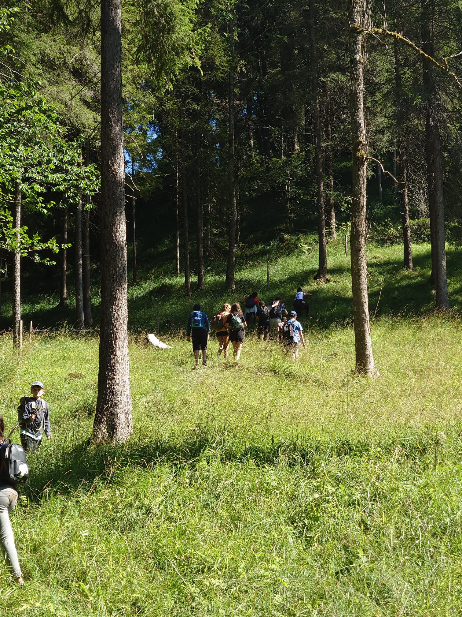 Auf dem Rückweg sind wir noch einmal über Wiesen und Hügel, wie auch durch den Wald. Über einen kleinen Trampelpfad sind wir zu einem Bach gekommen, wo wir unsere Badesachen auspacken und ein wenig plantschen konnten. Die kleinsten konnten sogar ein wenig schwimmen.