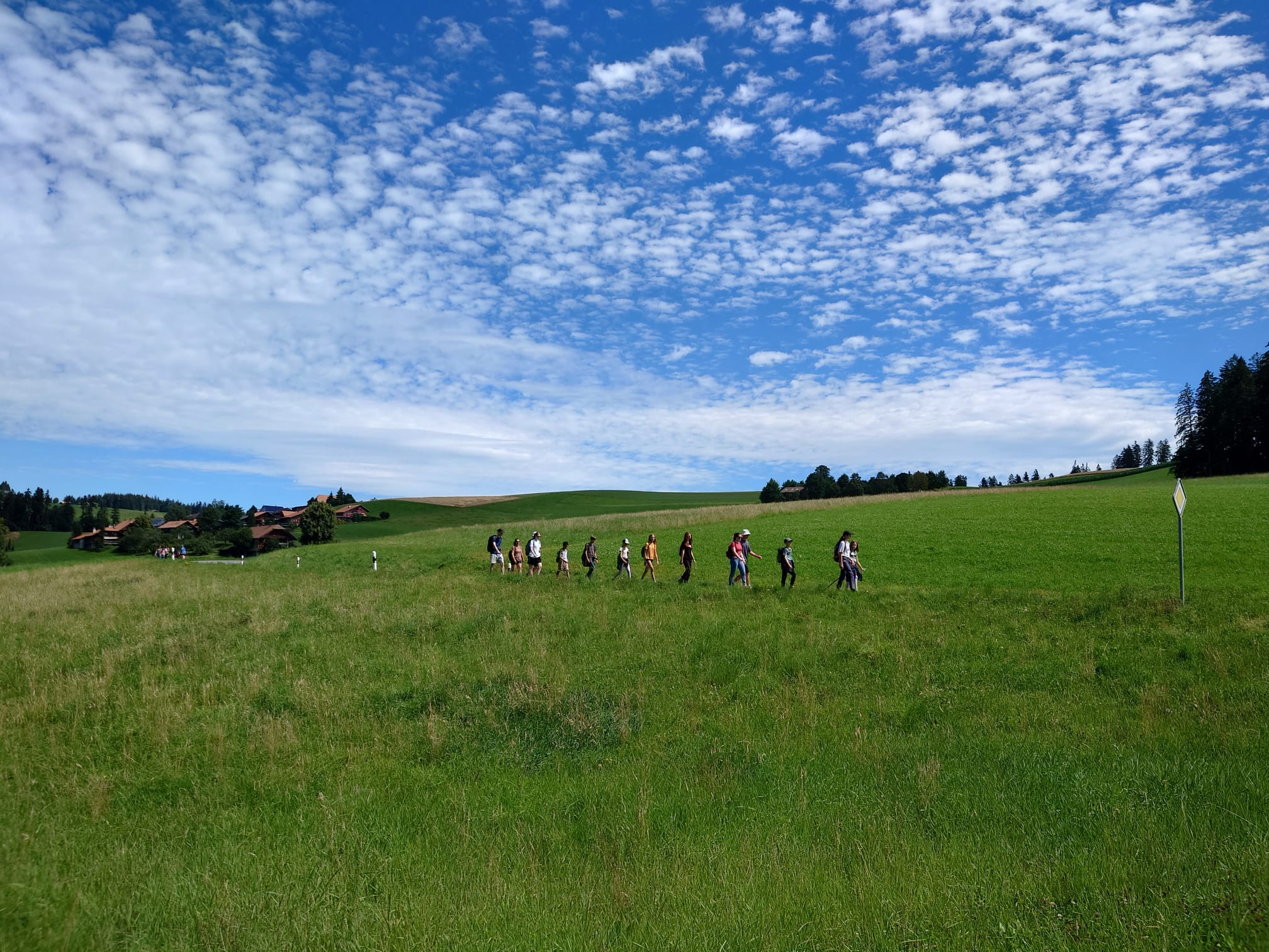 Mittwoch ist bekanntlich Wandertag. Das heisst wir haben uns um 10:15 Uhr auf den Weg gemacht und sind losgelaufen. Der Weg führte über Hügel und Wiesen, durch den Wald und über kleine Brücken. Auch durch ein paar Bauernhöfe und ein kleines Dorf sind wir gelaufen. Kurz vor 12 Uhr sind wir bei einer Grillstelle angekommen, wo es Schlangenbrot und Bratwürste oder Klöpfer gab. Doch vor dem Grillieren mussten zuerst Stöcke gesammelt und angespitzt werden.