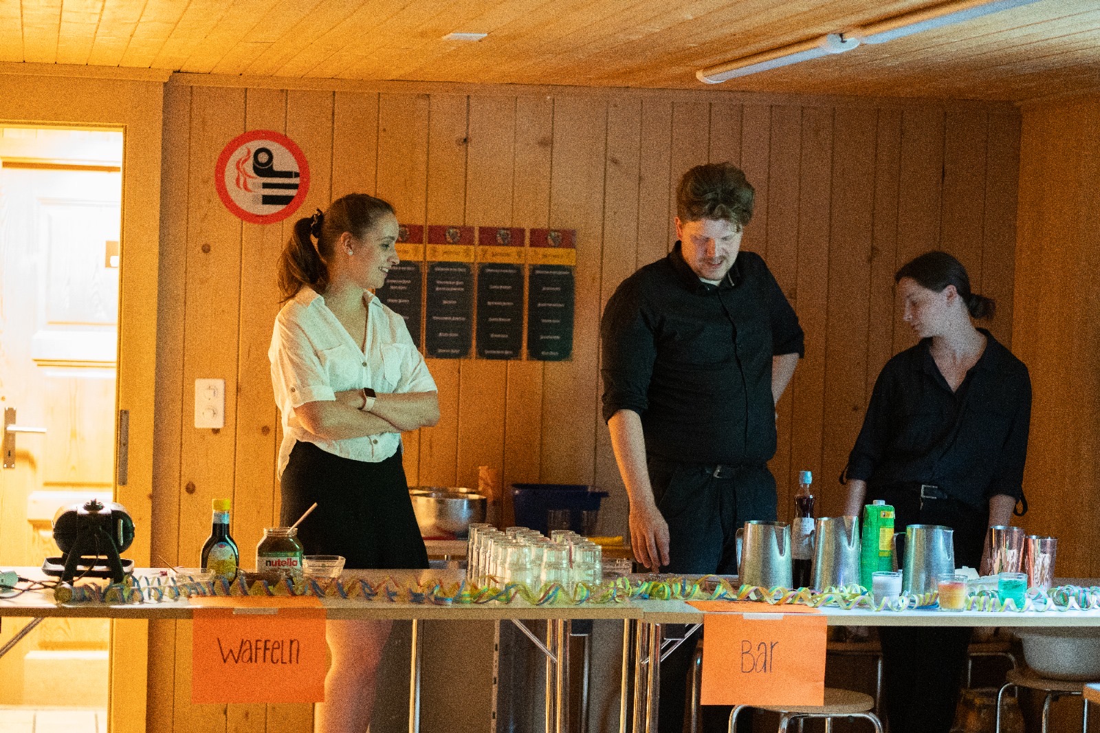 Nebst der Möglichkeit viel Geld an den verschiedensten Spielen, sei es Faden ziehen, Roulette, Büchsen werfen oder Blackjack, zu gewinnen, hatten wir auch die Chance das Geld wieder auszugeben. Denn es warteten die leckersten Cocktails auf uns, kreiert vom coolsten Barteam, wie auch zauberhaft farbige Waffeln, von den Waffelnexperten schlecht hin. Viel Glück, ein wenig Unglück und ein paar Schlürfer und Schmatzer später begaben wir uns dann nach dem Ritual auch wieder ins Bett. Dieser Tag war lang und doch leider viel zu kurz!