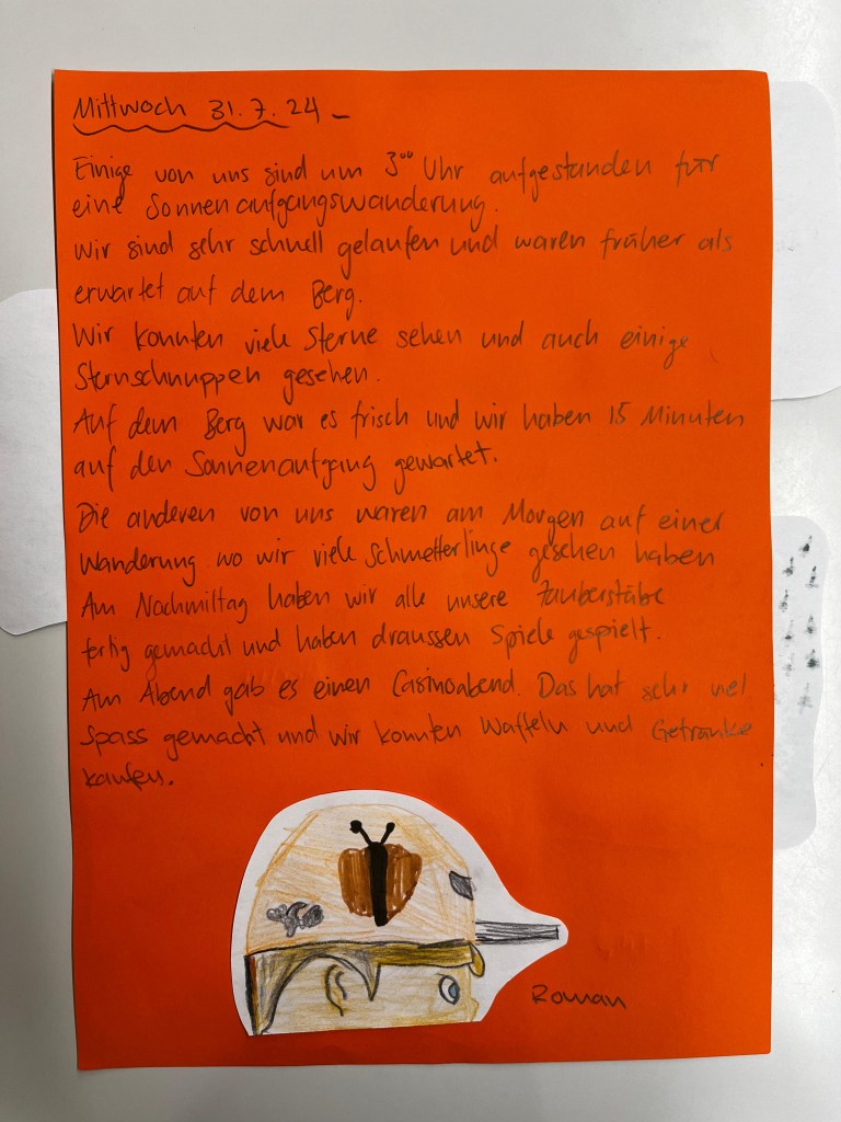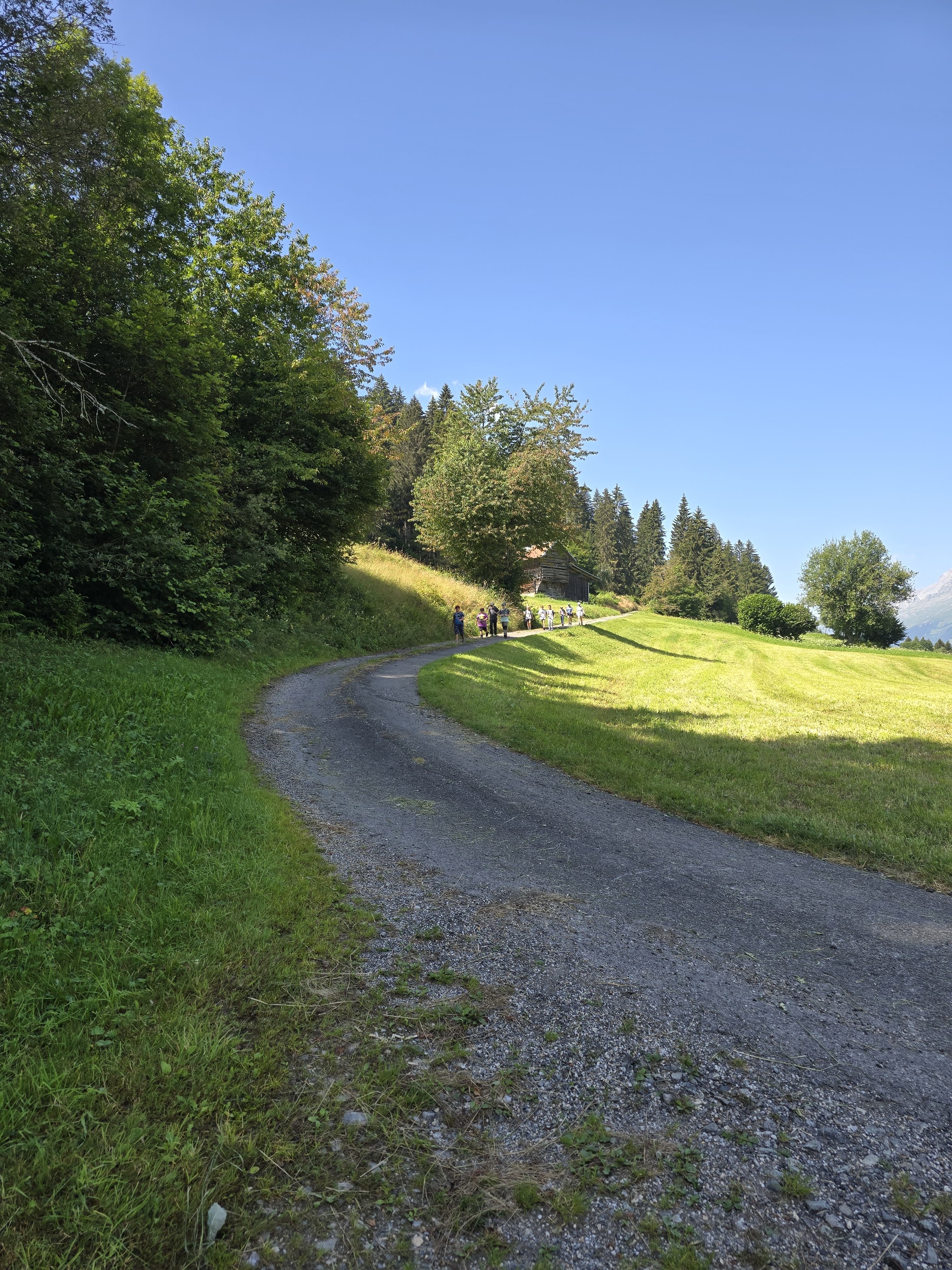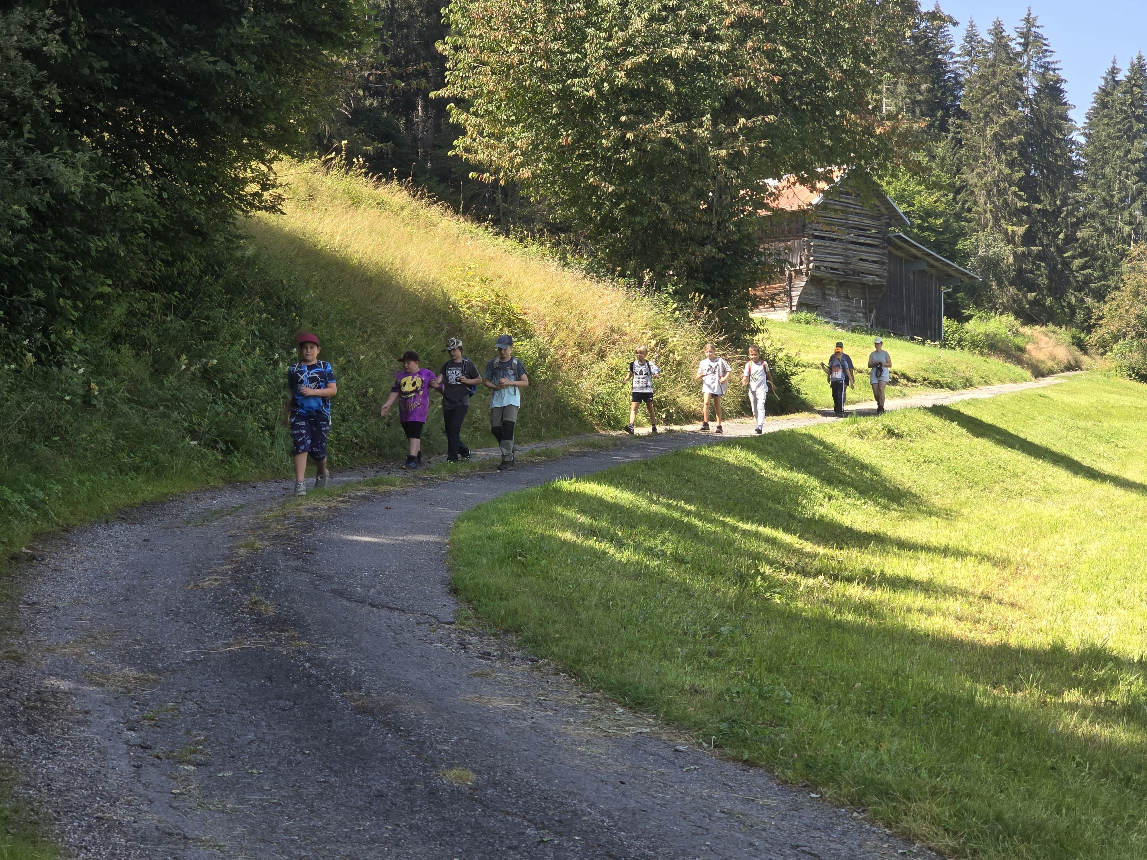 Die Wanderung der Kleineren war dann nach dem Konfibrot auf dem Programm. Wir durften ebenfalls unsere Wanderschuhe packen und liefen erstmal von der Sonne weg, denn diese fing immer wie mehr an zu scheinen. Wir sahen viele Schmetterlinge und genossen die Zeit zusammen. Auf dem Rückweg mussten wir uns dann in den schattigen Wald begeben und nicht komplett grilliert zu werden. Wieder im Haus angekommen konnten wir dann bald zusammen mit den Grossen einen wunderbaren Röhrensalat geniessen.
