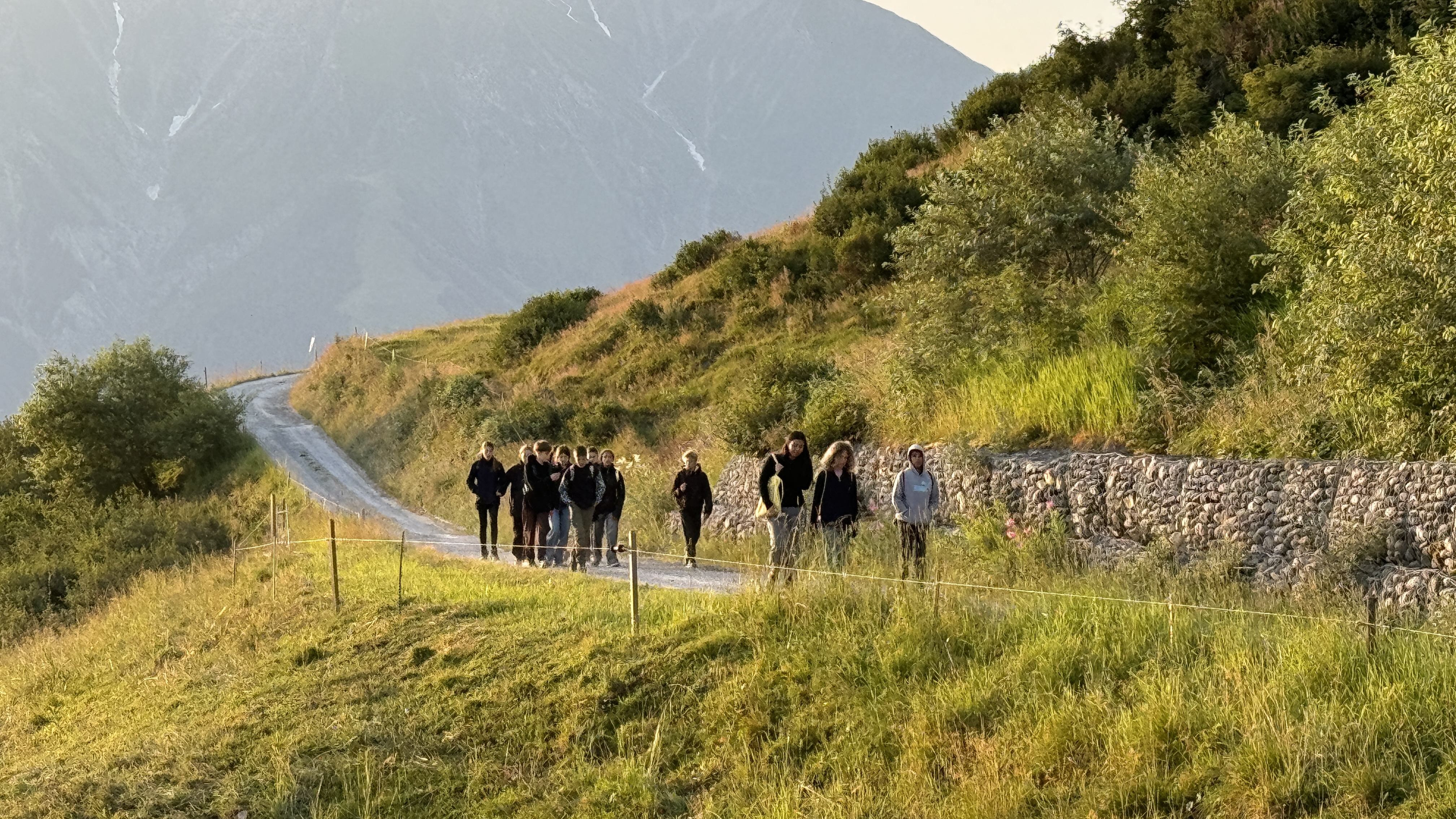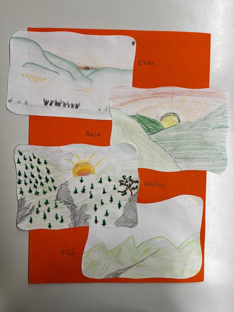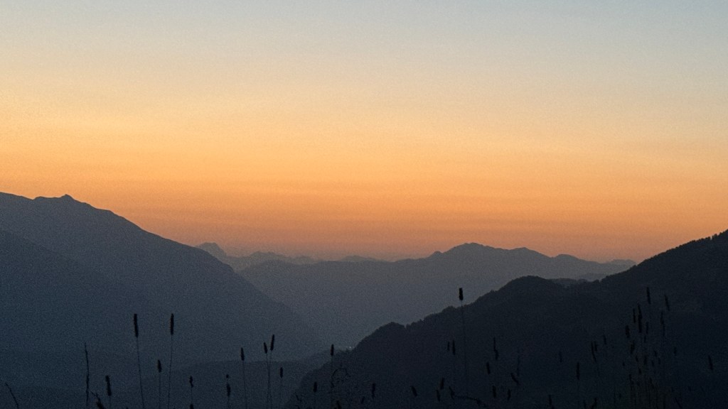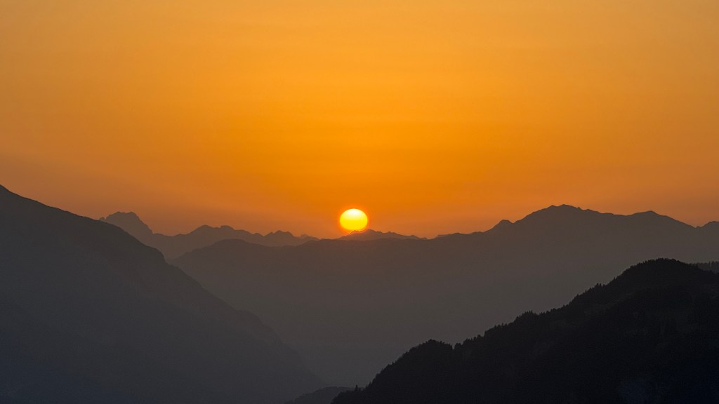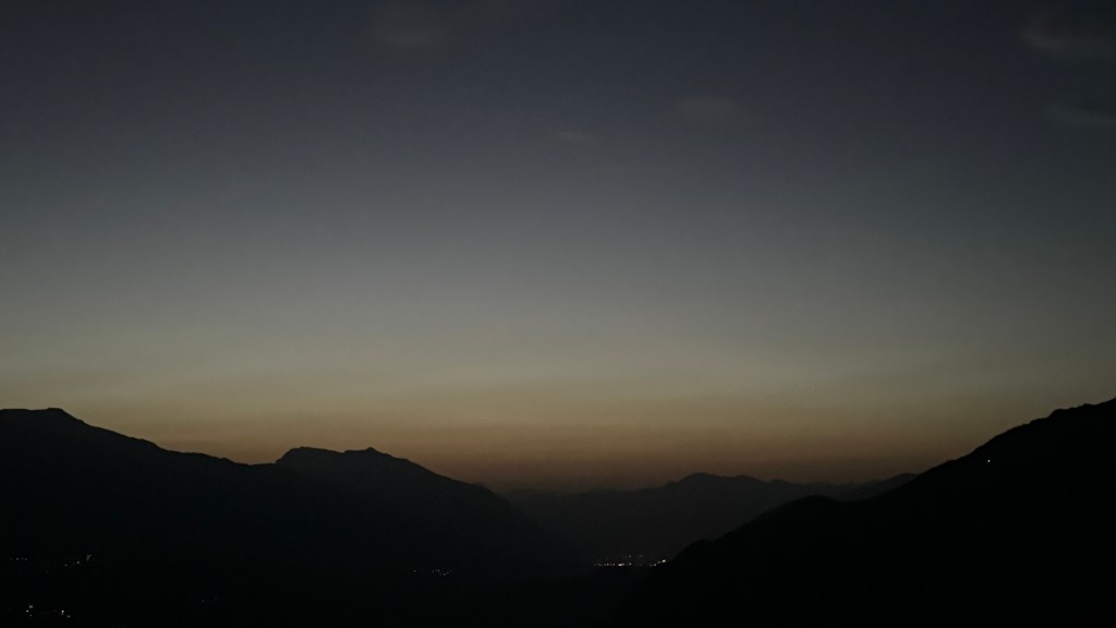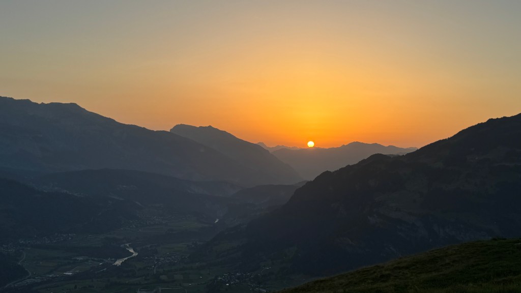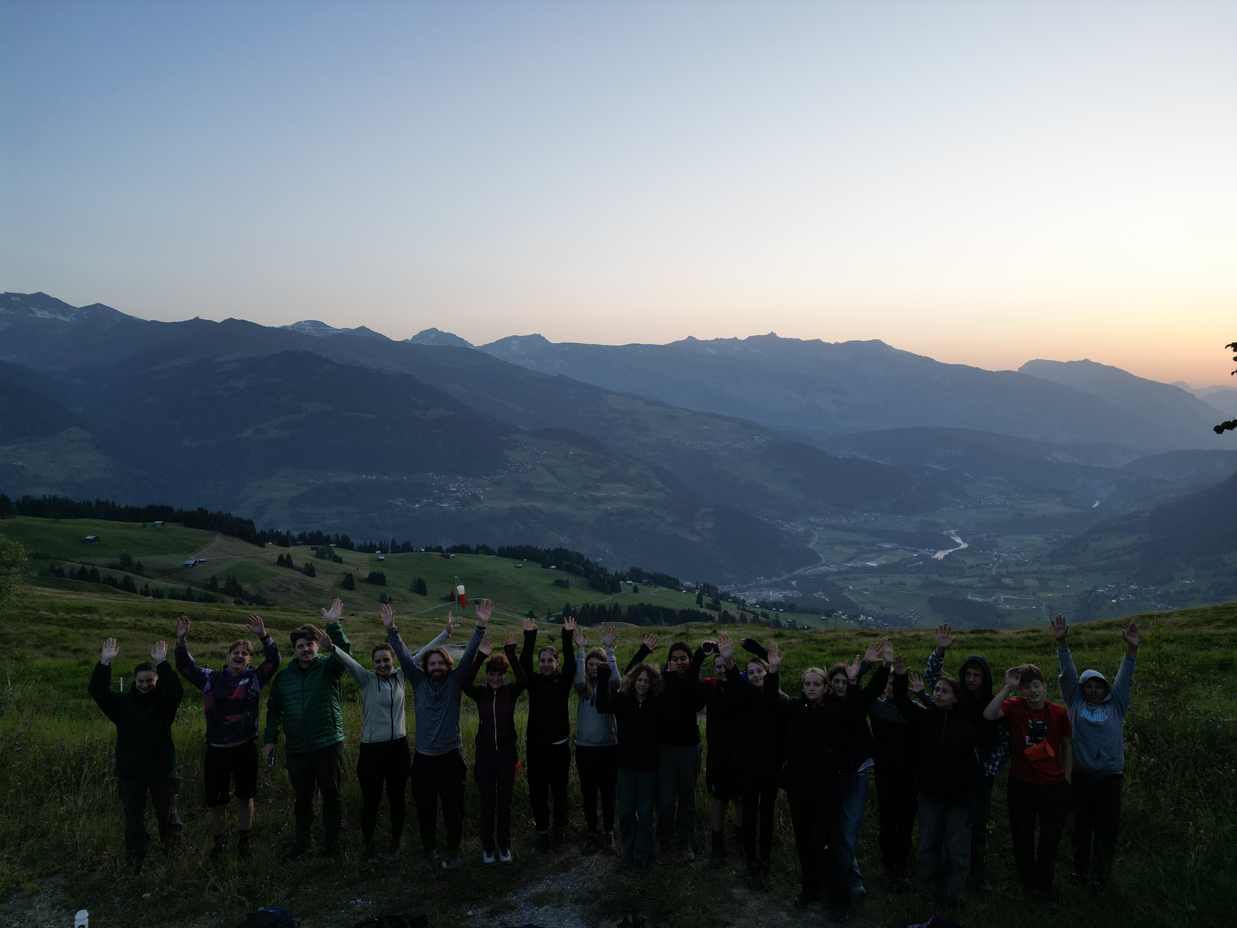 Heute fehlt Peter, denn der schläft noch als es für die Grossen bereits hiess „Aufstehen!“, aber laut wurde es nicht, denn dafür war es noch viel zu früh. Im Dunkeln packten wir unseren Rucksack mit Trinken, zogen die Wanderschuhe an und montierten den Pullover oder die Jacke. Im Speisesaal wurde dann allen von uns ein Teil des Frühstücks eingepackt. Danach hiess es „Los gehts!“. Denn für die Grossen war heute der erste Traktandenpunkt eine Wanderung den Berg hinauf, nur im Licht vom Mond, und vielleicht einigen Taschenlampen. Der Tag brach langsam heran und wir meisterten Höhenmeter um Höhenmeter. Nach einem eher steileren Beginn wurde es zum Glück immer flacher, aber auch windiger und somit wieder Zeit für Jacke oder Pullover. Weit hatten wir aber nicht mehr und bald sahen wir das Restaurant Bünder Rigi, unser Ziel. Dort angekommen machten wir uns auf dem Platz vornedran breit und genossen noch in der Blauen Stunde unser Frühstück. Als es dann langsam an der Zeit war für den Sonnenaufgang suchten wir uns alle den besten Platz und warteten gespannt.