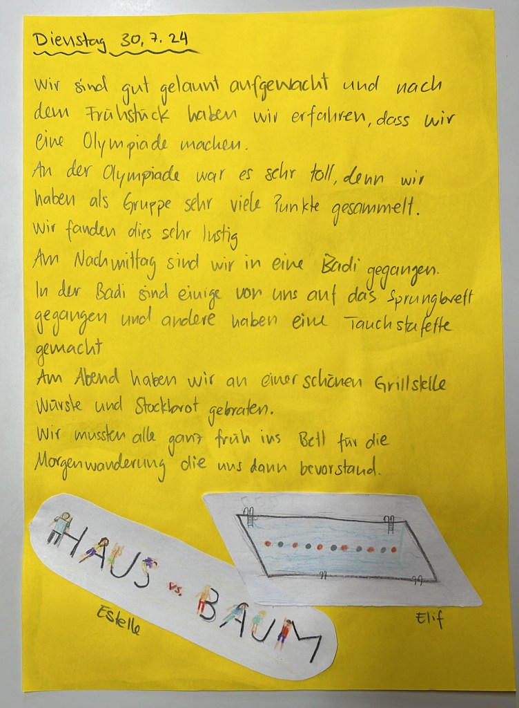 Mit vollem Magen ging es dann sogleich auch weiter. Sonnencreme auf der Haut, Badekleider angezogen und Rucksack gepackt machten wir uns auf den Weg zum Bus. Im Tal unten angekommen, liefen wir ohne Umwege direkt zum Schwimmbad. Die ersehnte Abkühlung an solch einem heissen Nachmittag. Im Schwimmbad durften wir dann zusammen Unterwasserrätsel lösen oder unsere Akrobatik vom Sprungturm zur Schau stellen. Ein leckeres Glacé oder etwas Süsses verzauberte den Aufenthalt zum Schluss.