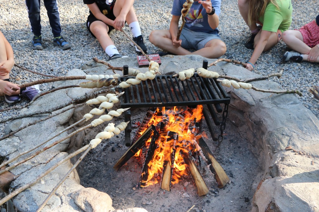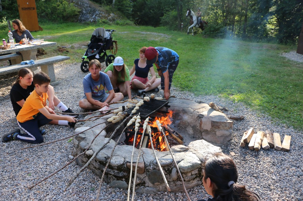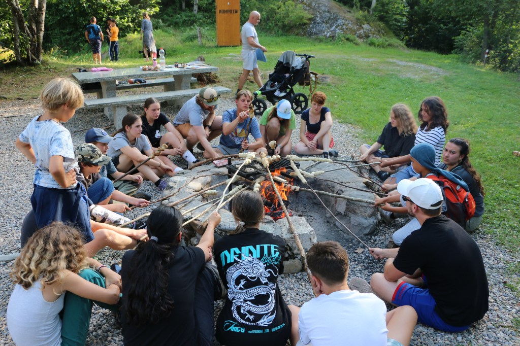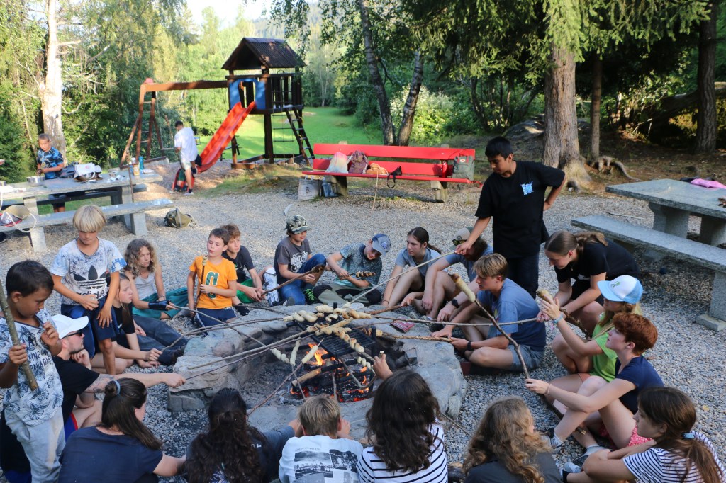 Mit dieser wohlverdienten Entspannung ging es nach der kurzen Fahrt zurück zum Haus wieder direkt weiter, Badekleider weg, Wanderschuhe an und los. Wir liefen durchs Dorf Flond, vorbei an der Kirche und ein paar Baustellen hinauf in den Wald. Oben am Hang angekommen wurden wir von lodernden Flammen empfangen. Eine Steckensuche und Anspitzaktion später schlungen wir unser Schlangenbrot um den Ast und machten es uns vor dem Feuer gemütlich. Mit dem Brot im Magen bildeten wir das perfekte Bett für eine leckere Bratwurst oder einen knackigen Klöpfer. Ein wenig Spiel und Spass später brachen wir dann auch wieder auf, denn heute müssen wir früh ins Bett, das nächste Abenteuer wartet bereits auf uns.