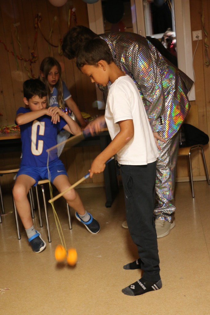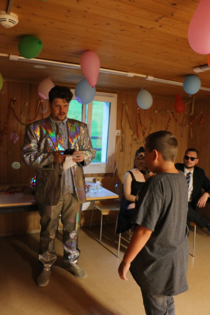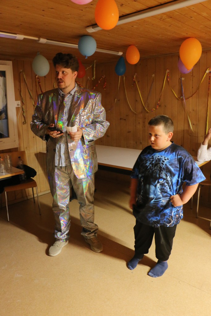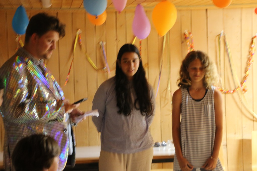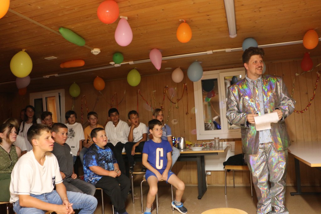 Als dann das Mahl vorbei war wurden wir aus dem Speisesaal geführt und wurden kurzzeitig anderswo unterhalten. Doch dann wurden wir in einen komplett umgestalteten Raum geführt und mussten uns vor der Bühne hinsetzen. Es war still und alle Leitenden verschwunden, da ging auf einmal laute Musik los und wir wurden geblendet, denn vor uns stand da, posierend ein Herr gleich einer Discokugel. Nach dem ersten grossen Lachen wurden wir dann begrüsst zur Lagershow Zauber, dass ..? Eine Show bei der jeweils die Leitenden entscheiden mussten ob wir unsere Wette schaffen würden oder nicht. Je nachdem ob man falsch lag oder es nicht geschafft hatte wurde dann die Bestrafung ausgeführt. Es wurde angefeuert, gejubelt, gelacht und genossen. Es war unglaublich witzig und die Sprüche vom Moderator flossen wie ein Wasserfall.
