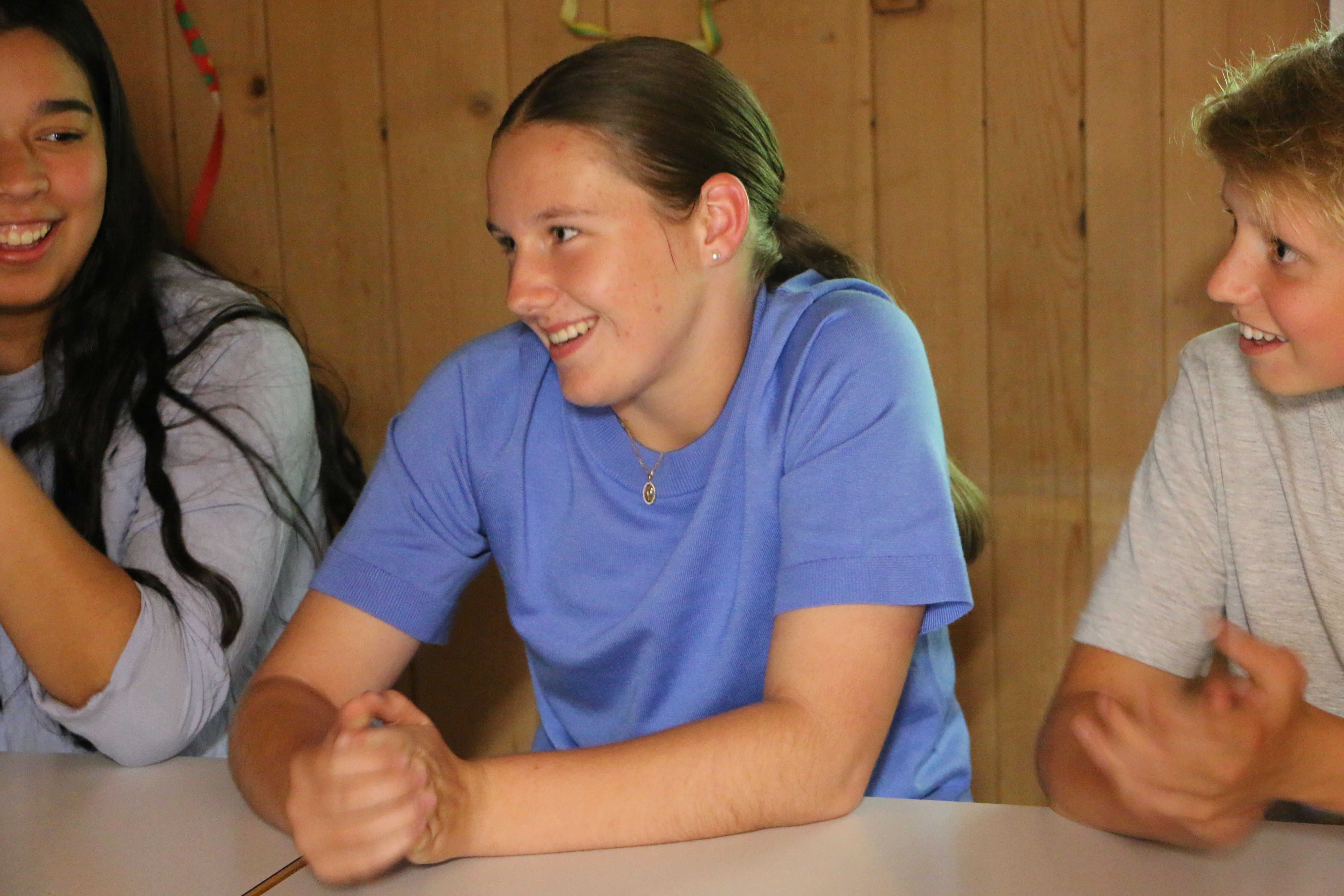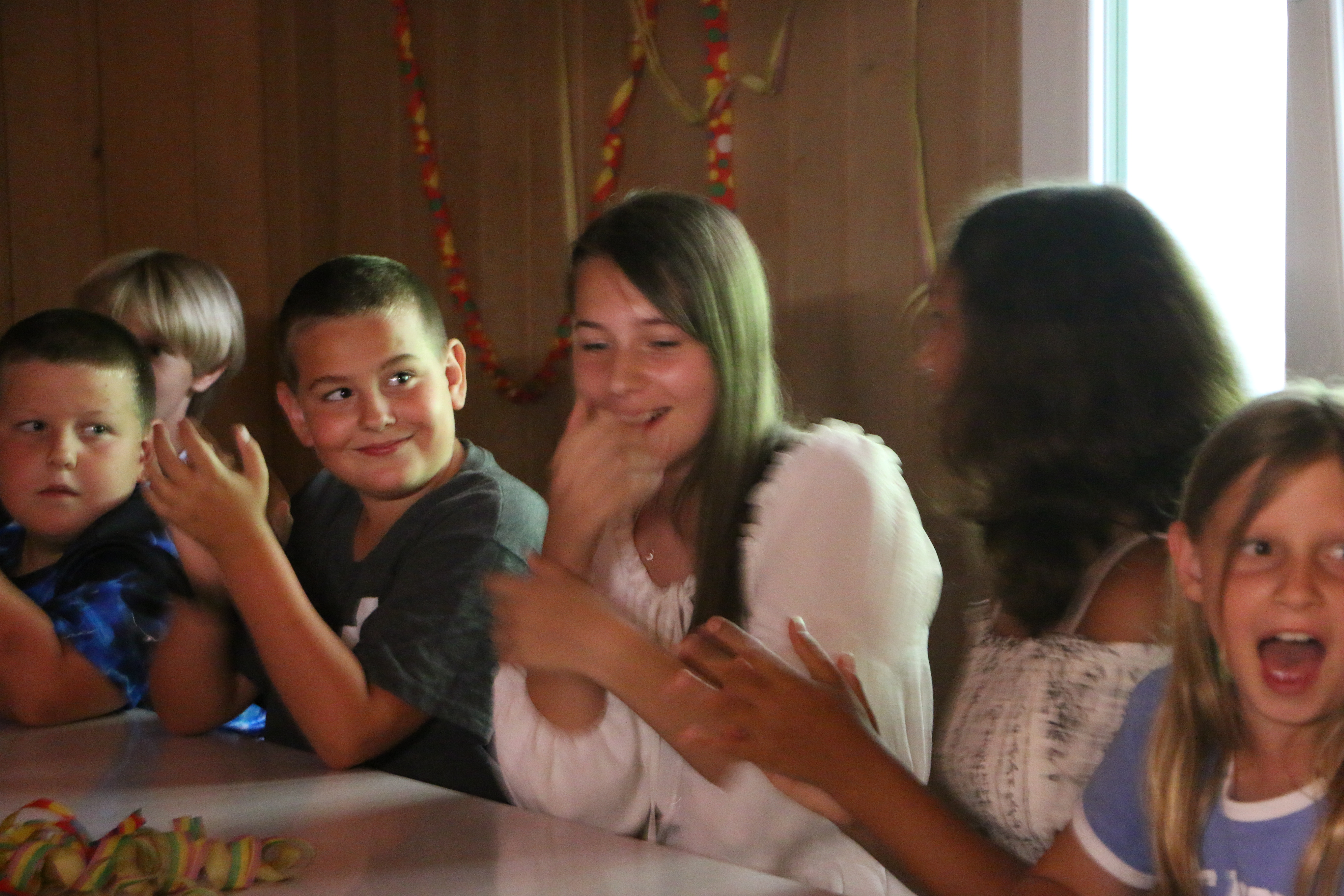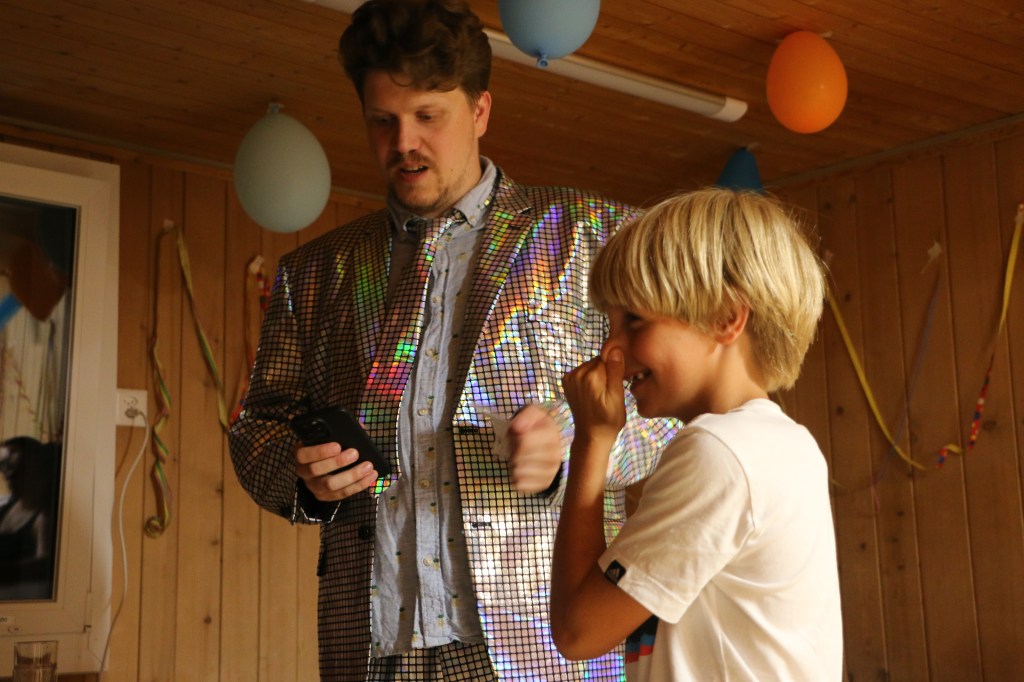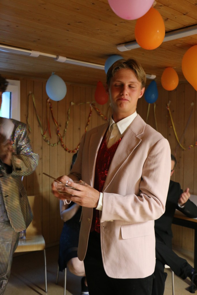 Als dann das Mahl vorbei war wurden wir aus dem Speisesaal geführt und wurden kurzzeitig anderswo unterhalten. Doch dann wurden wir in einen komplett umgestalteten Raum geführt und mussten uns vor der Bühne hinsetzen. Es war still und alle Leitenden verschwunden, da ging auf einmal laute Musik los und wir wurden geblendet, denn vor uns stand da, posierend ein Herr gleich einer Discokugel. Nach dem ersten grossen Lachen wurden wir dann begrüsst zur Lagershow Zauber, dass ..? Eine Show bei der jeweils die Leitenden entscheiden mussten ob wir unsere Wette schaffen würden oder nicht. Je nachdem ob man falsch lag oder es nicht geschafft hatte wurde dann die Bestrafung ausgeführt. Es wurde angefeuert, gejubelt, gelacht und genossen. Es war unglaublich witzig und die Sprüche vom Moderator flossen wie ein Wasserfall.