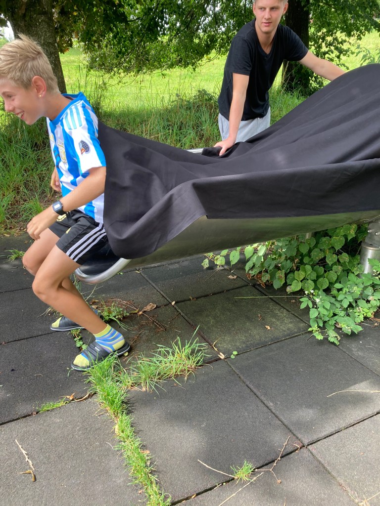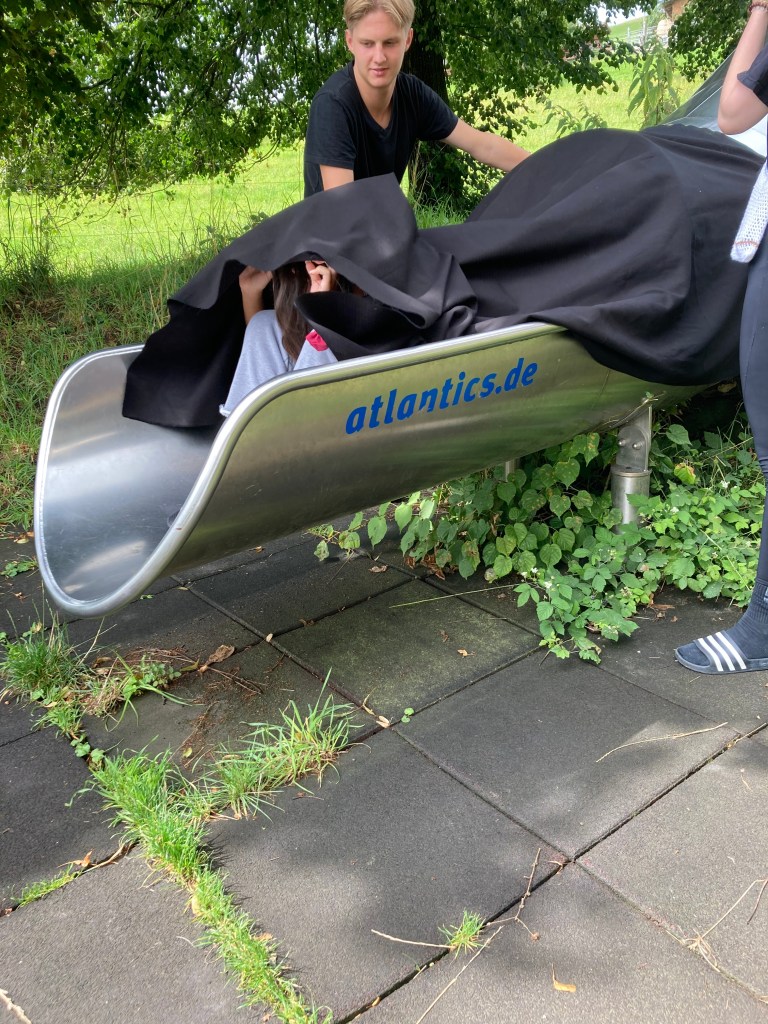 Dann geht es los mit der Reise ins Ungewisse. Durch das dunkle All rutschten wir bis auf den Mond! Zum Glück sind wir da alle heile angekommen. Denn hier auf dieser grauen Kugel ist alles so viel leichter als auf der alten Erde. Damit wir aber nicht unsere Heimat komplett vermissen, erfreuten wir uns noch über ein paar Erdschichten zum Mittagessen und gingen gestärkt in den Nachmittag.